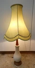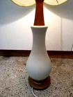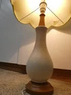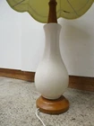 VINTAGE MATT WHITE CERAMIC AUSTRALIAN POTTERY LAMP BASE TIMBER STEM 1960s MCM 79 CM HIGH TO TOP OF LAMP SHADE GOOD WORKING CONDITION FINE CRAZING TO CERAMIC BASE - SMALL HOLE TO INNER SILK LINING OF THE SHADE - SOME TRIM IS LOOSE - LIGHT WEAR SEE PHOTOS FOR BEST GUIDE TO SIZE AND CONDITION I can combine for postage. CHECK MY OTHER LISTINGS FOR MORE