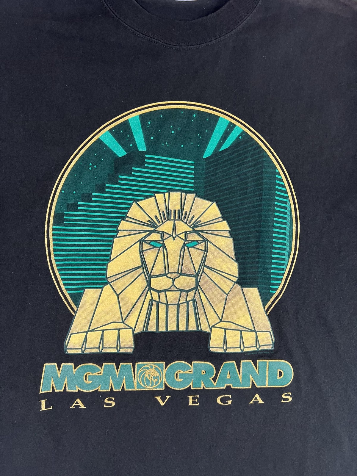 Brand/Subject: MGM Grand Las Vegas Tag info: TM & ©1993 MGM Grand Hotel, Inc. Material: 100% Cotton Made in U.S.A. Size: Large (Mens) Color: Black with teal and gold graphic Design: Large front graphic of the MGM Grand lion with stylized skyline; text reads "MGM GRAND LAS VEGAS." Style: Short sleeve crewneck shirt Era: 1993 (90s vintage) Labels: "Made exclusively by MGM Grand" neck label present Care tag (visible text): Machine wash cold water; wash separately; no bleach; tumble dry low Notes: Measurement tools shown in photos for reference only.