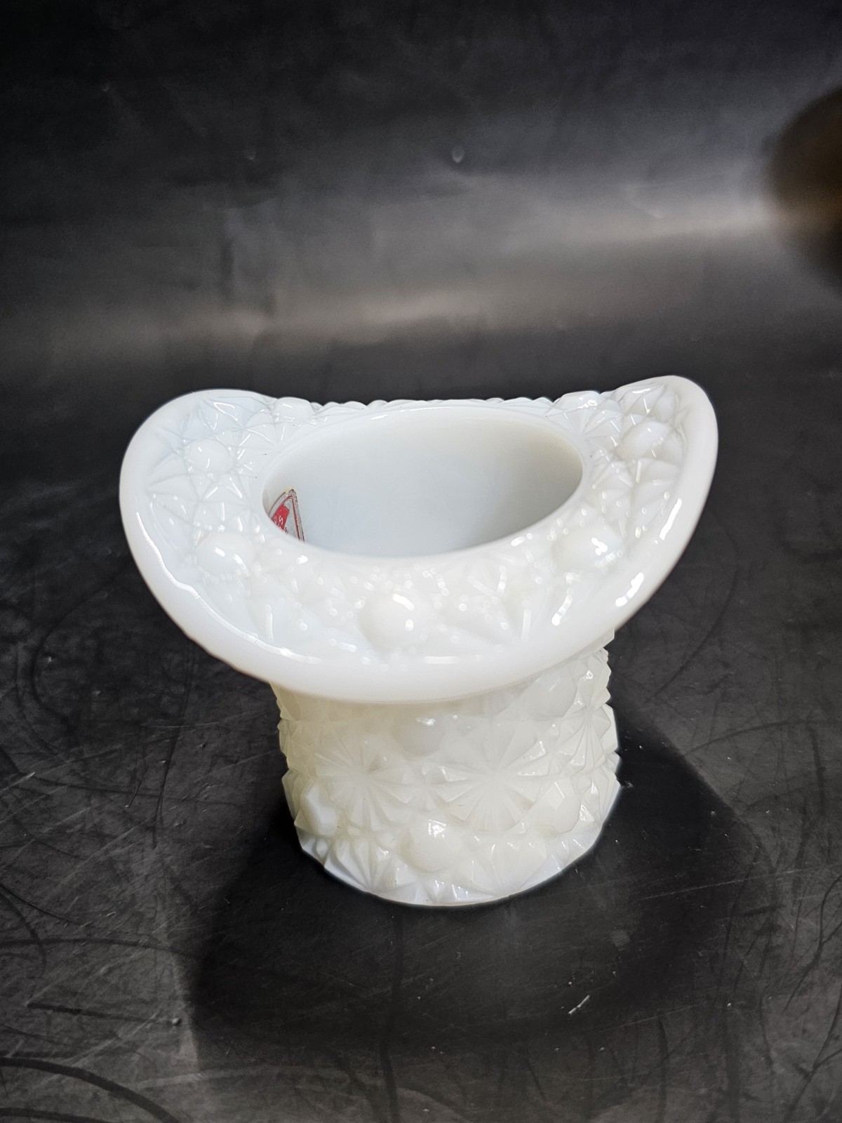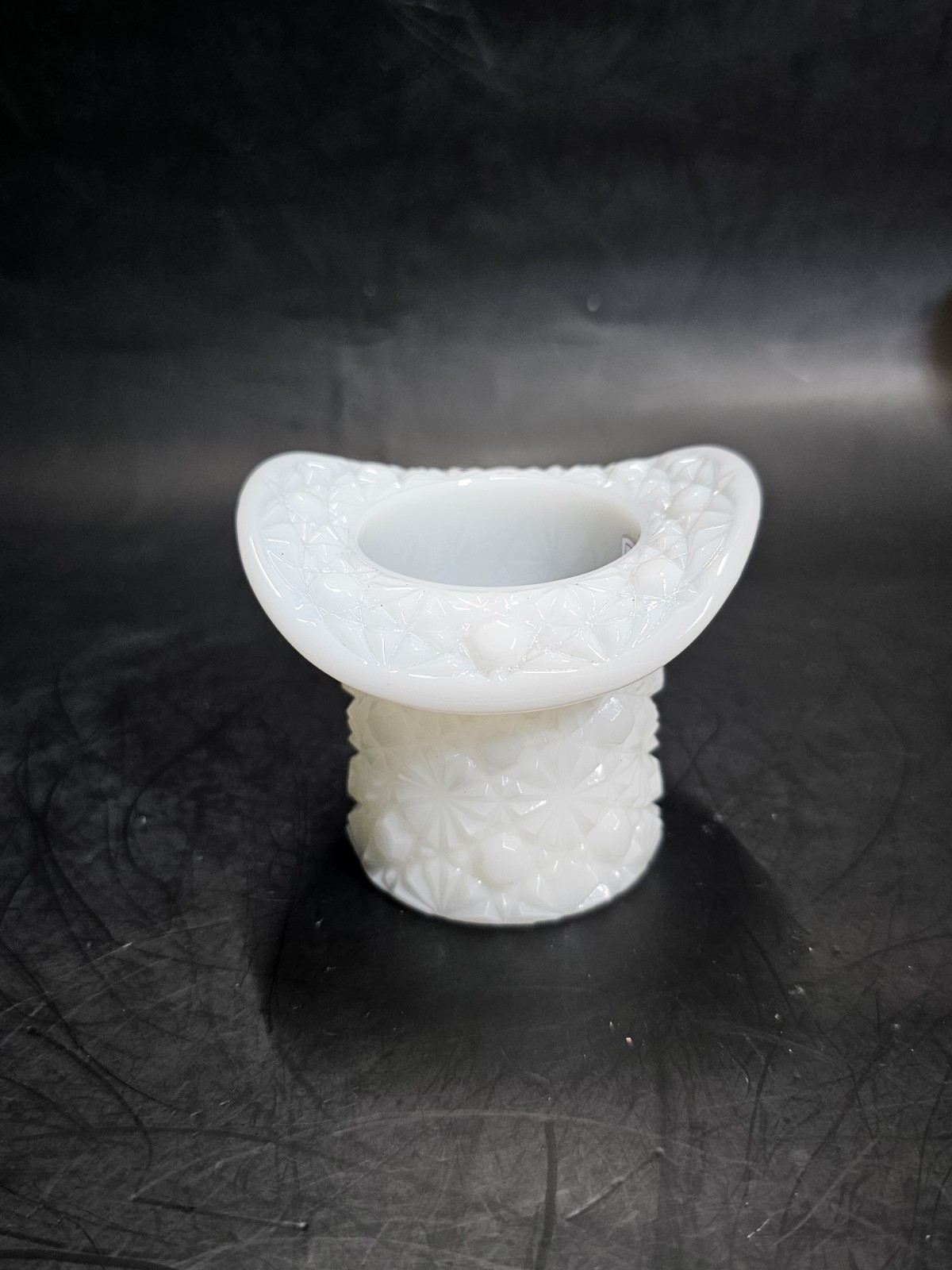 In excellent condition This Vintage Mid Century Fenton Milk Glass Top Hat Daisy Dot Toothpick Holder is a charming piece of decorative pottery and glassware originating from North America. The elegant design features a classic daisy and dots pattern on white milk glass, with a whimsical nod to the subject of a top hat. This vintage original piece from the Fenton brand captures the essence of the mid-century era with its unique style and production techniques. Perfect for collectors or those looking to add a touch of nostalgia to their home decor.