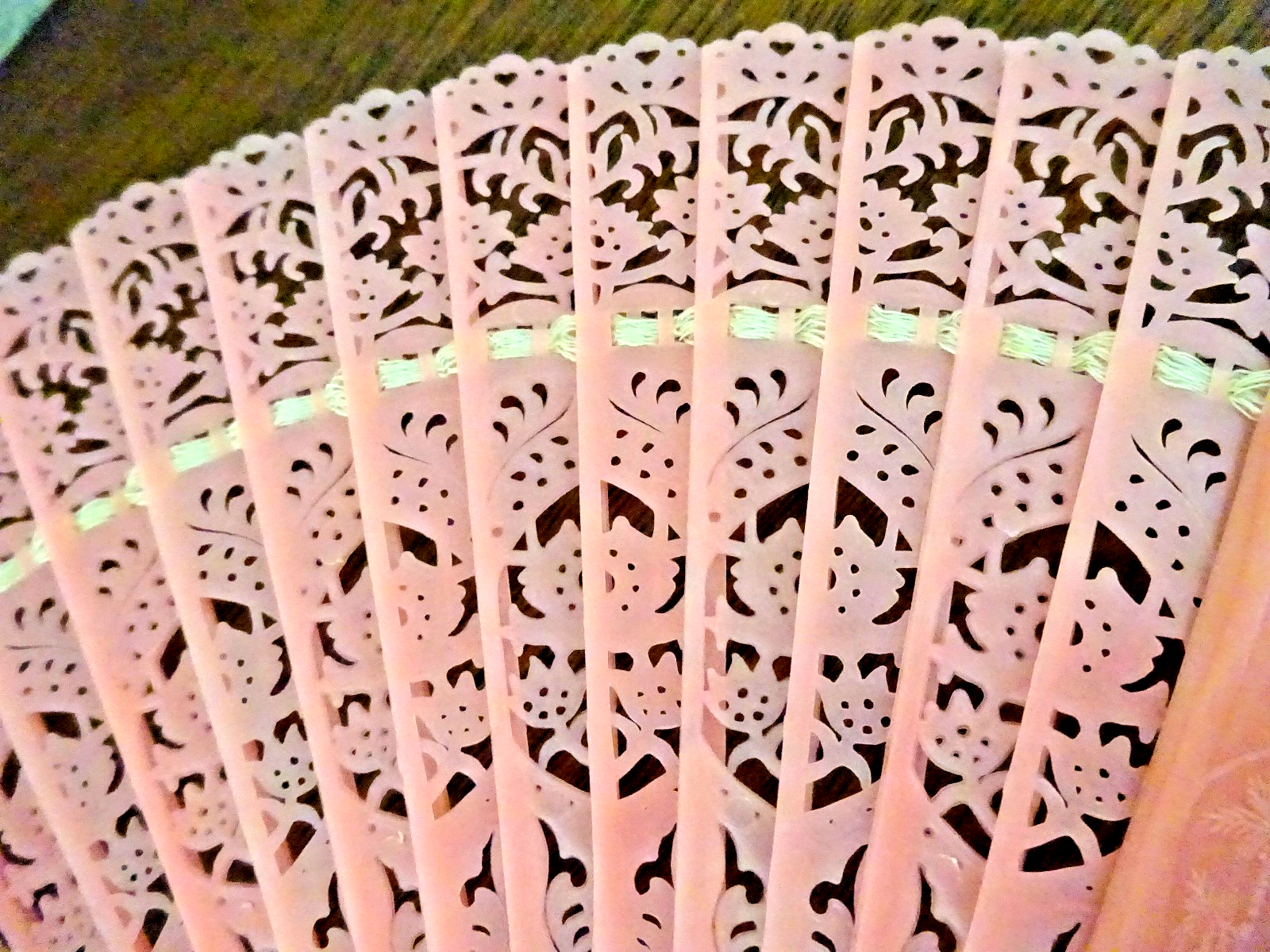 For your consideration is a vintage mid-century pink plastic folding lace hand fan. It measures 7" long and 12" wide when unfolded. It is part of an estate collection and is in very good condition. Clean and smoke free. I try to describe evident defects, but may miss some, which does not constitute an item "Not as Described". Any color spots or discoloration you may see is a reflection unless described otherwise. This item is sold "as pictured and as described", so please ask questions before bidding. All items are satisfaction money back guaranteed. Winning bidder pays S&H. I combine S&H on multiple purchases .