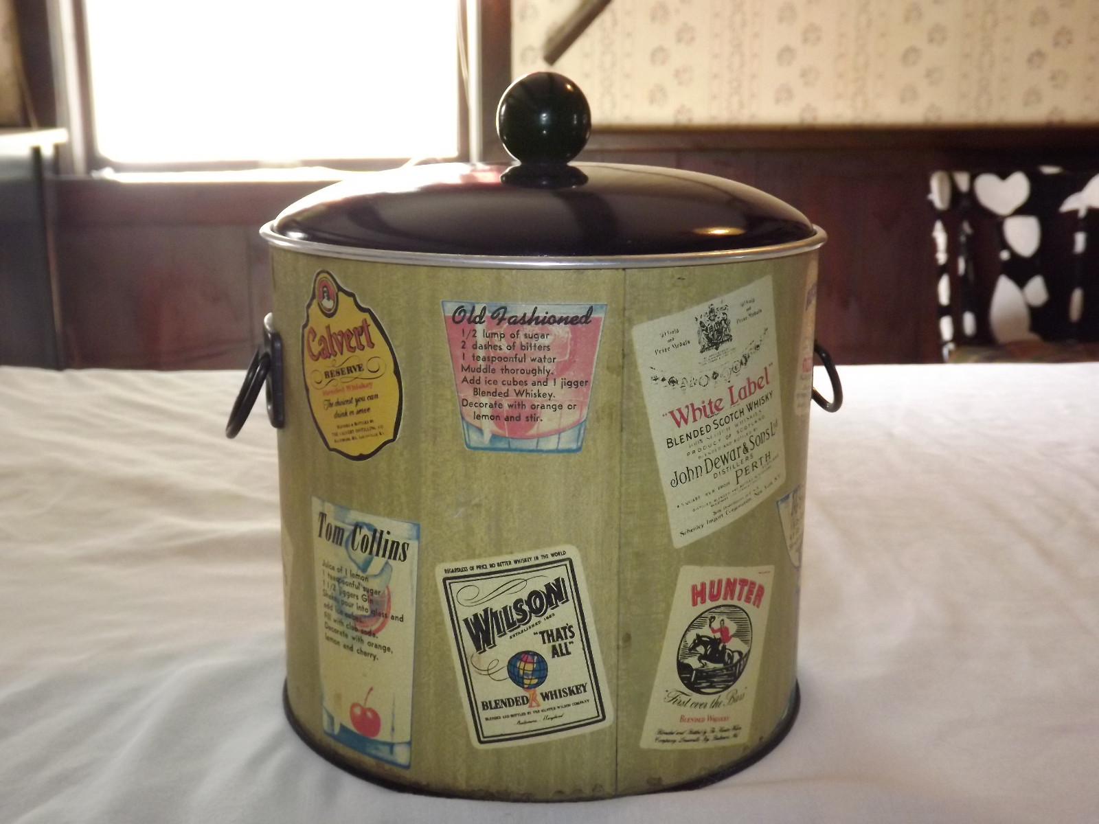 YOU ARE BIDDING ON...... VINTAGE OLD BAR 1960S VARIOUS LIQUOR DRINKS METAL ICE BUCKET..... ...MEASURES APPROX 9" HIGH..8" ACROSS BOTTOM...... SHOWS SOME USAGE/AGE WEAR..HAS SCRATCHES/PAINT LOSS/AGE DISCOLORATION......PLEASE VIEW PHOTOS FOR CONDITION.***PLEASE E-MAIL IF YOU HAVE A QUESTION OR WANT AN ADDITIONAL PICTURE....PLEASE VISIT MY EBAY STORE FOR ADDITIONAL VINTAGE ITEMS..THANK YOU*** BX7180-10N-0554