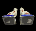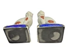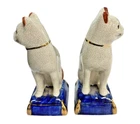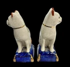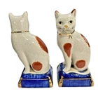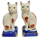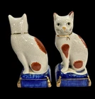 VINTAGE PAIR FITZ & FLOYD STAFFORDSHIRE STYLE PORCELAIN CAT ON PILLOW BOOKENDS A FINE VINTAGE PAIR OF FITZ & FLOYD STAFFORDSHIRE STYLE PORCELAIN CAT BOOKENDS, FEATURING TWO STANDING CAT FIGURINES PERCHED ON COBALT BLUE AND GOLD PILLOWS. THESE CHARMING CATS ARE DECORATED WITH RED AND WHITE SPOTS AND HAVE THE APPEARANCE OF ANTIQUE CRAZED POTTERY, WITH INTRICATE FACIAL DETAILS AND BOLD COLORS. ESTATE FRESH, USED CONDITION. CATS MEASURES 8" IN HEIGHT X " 3 1/2" IN WIDTH. MARKED AS SHOWN. PLEASE SEE ALL IMAGES AS THEY ARE AN INTEGRAL PART OF THE DESCRIPTION AND ASK ALL QUESTIONS PRIOR TO BIDDING. ALL ITEMS ARE PRE-OWNED AND AS SUCH MAY SHOW SOME SIGNS OF PREVIOUS USE SUCH AS MINOR MARKS AND BLEMISHES. PLEASE CONTACT US IF YOU WISH A MORE DETAILED DESCRIPTION OF A PARTICULAR ITEM.