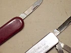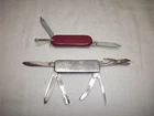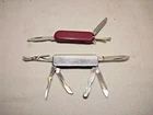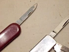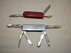 Both used very little, red one 2 1/4" closed marked stainless China. second one 2 5/16" closed marked stainless Japan on side of knife engraved RECONIZING PTS 10 MILLION SAFE MANHOURS 1962. Good condition.