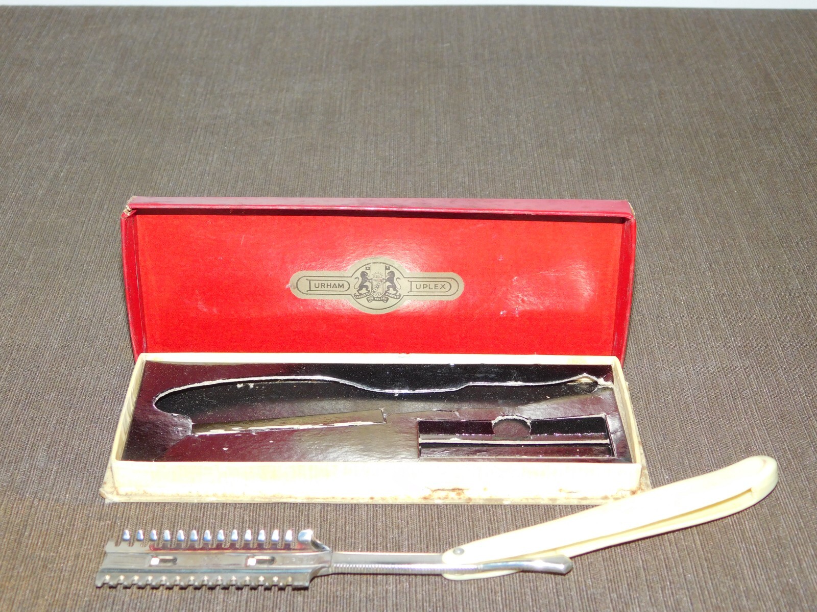 YOU ARE BIDDING ON..... VINTAGE SHAVING DURHAM DUPLEX STRAIGHT RAZOR IN BOX ... ....SHOWS SOME USAGE/AGE WEAR..HAS SCRATCHES/PAINT LOSS/AGE DISCOLORATION...BOX HAS SMALL TEARS/STAINS/AGE DISCOLORATION. .. PLEASE VIEW PHOTOS FOR CONDITION.***PLEASE E-MAIL IF YOU HAVE A QUESTION OR WANT AN ADDITIONAL PICTURE....PLEASE VISIT MY EBAY STORE FOR ADDITIONAL VINTAGE ITEMS..THANK YOU***3W-BX0503-XXXX