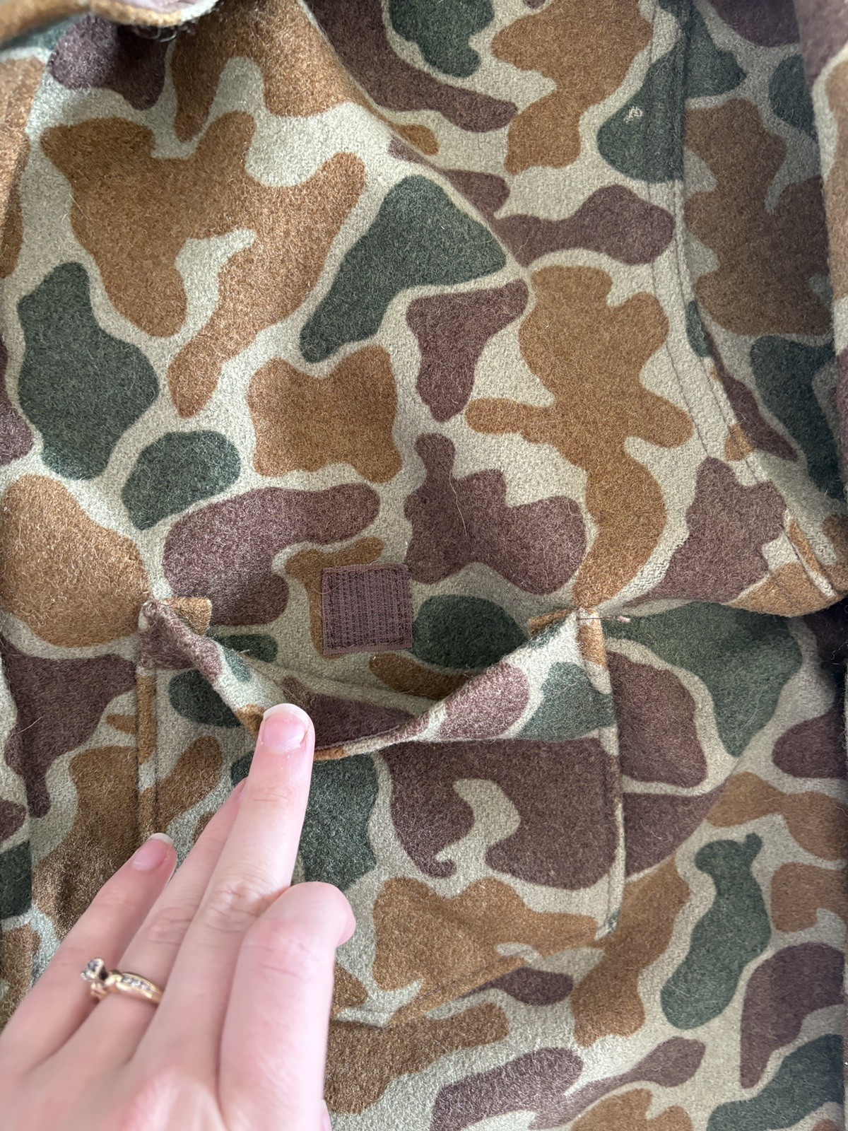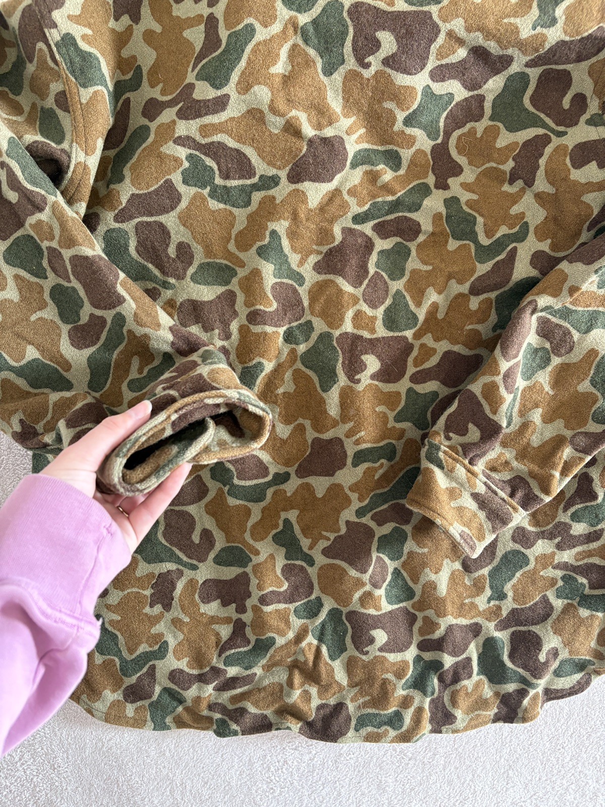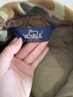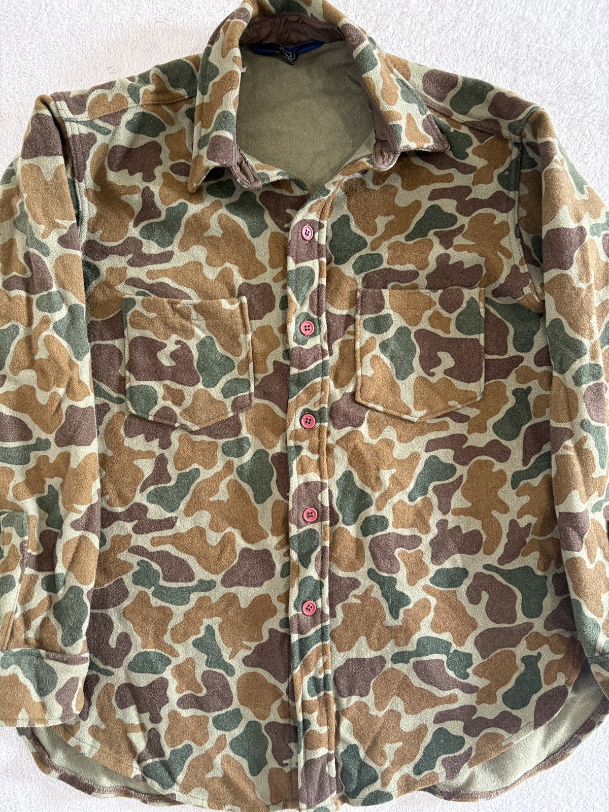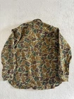 Vintage 100% Wool button-up long sleeve shirt Size large Great quality and warm The style of camo is duck or frog camo The colors are different shades of green and brown All buttons are intact Made in USA 2 front pockets with Velcro