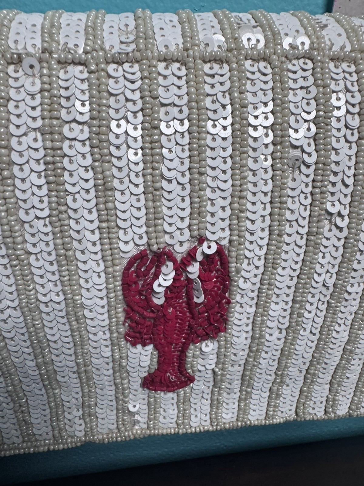 The product is a handmade beaded lobster bag from India, designed specifically for women. The exterior color of the bag is white with a lobster-like design, giving it a unique and eye-catching look. The beaded accents add a touch of craftsmanship and charm to the shoulder bag, making it a standout accessory for any outfit. The brand, handcrafted in India, ensures the authenticity and quality of the product, making it a desirable choice for those looking for a beautiful and one-of-a-kind accessory.
