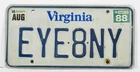 *From A Virus-Free, Smoke-Free Environment* VIRGINIA 1988 LICENSE PLATE # "EYE-8-NY" VG CONDITION This plate is more than 3 years old and is for collectible purposes only and cannot be displayed on any vehicle . Ships Today !! We appreciate your patronage! Shop Dumfries VA A Veteran Owned & Operated eBay Store Established 2004