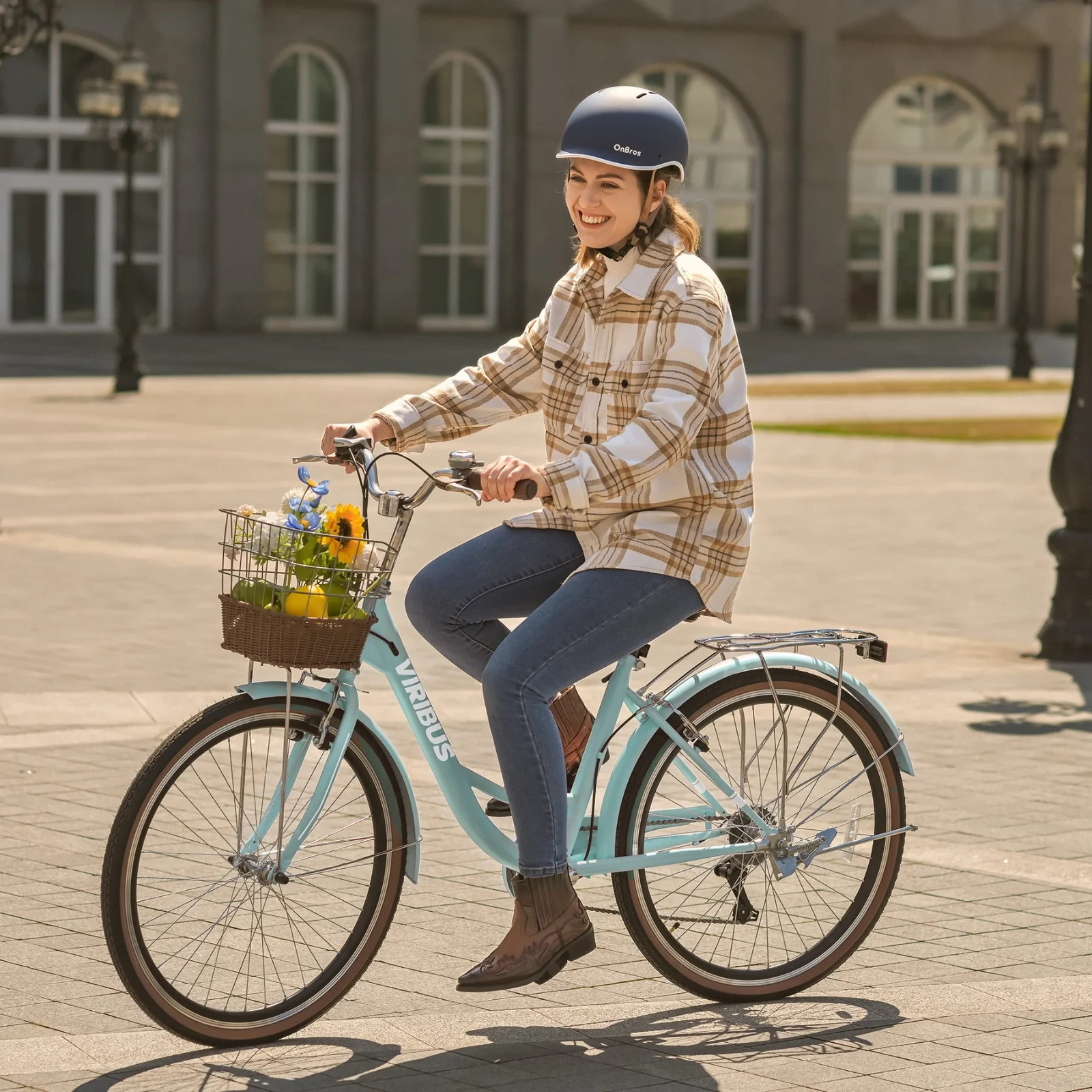 Product details Enjoy a healthier and more sustainable lifestyle with this women’s comfort bike! The design of this cruiser bike draws upon the classic step through bikes, creating a unique take on the everyday beach & city cruiser bike. Effortlessly shift gears with the 7-speed Shimano derailleur and thumb shifters, ensuring a smooth ride on any terrain. With a chic rattan front basket and reinforced rear rack, you can easily carry groceries, essentials, or even your furry friends along for the ride. Crafted from high carbon steel and featuring a low step-through frame, this bike for women is both strong and accessible, supporting riders up to 330 lb. Whether you're commuting to work or exploring new adventures, this women's bicycle ensures you'll arrive in comfort and confidence. Get out There: This women’s bike is the perfect way to travel in style and safety; it has a combination of a retro look inspired by comfort bikes and modern features, making it a unique beach & city cruiser bicycle that stands out from the crowd. Smooth Shifting: Equipped with a 7-speed Shimano derailleur and user-friendly thumb shifters, this cruiser bike ensures smooth and precise gear changes for stable rides on various terrains, from city streets to winding trails. Front & Rear Storage: This women's bicycle features a stylish rattan front basket and a reinforced rear rack, enabling you to effortlessly store groceries, carry essentials, or even bring your furry companions along on your urban escapades. Safe & Cozy Ride: Thanks to its shock-absorbing cushioned saddle, front & rear V brakes, and duplex aluminum rims, this bike for women is designed to provide a secure and wobble-free ride, ideal for extended commutes and adventures. Ideal Match for You: Expertly crafted from high carbon steel and featuring a low step-through frame, this comfort bike is tailored to offer optimal support for riders weighing up to 330 lb. and ranging in height from 5'1" to 5'7". Specifications Material: Carbon Steel, Rubber, Aluminum Alloy Color: Mint Tire Diameter: 24 in. (61 cm) Overall Length: 64.6 in. (164 cm) Handlebar Length: 25.2 in. (64 cm) Seat Height: 35.4 in. (90 cm) Front Basket Dimensions: 12.8 x 9.3 x 8.5 in. (32.5x23.5x21.5 cm) Rec. Rider Height: 5 ft. 1 in. -5 ft. 7 in. (155-175 cm) Weight Capacity: 330 lb. (150 kg) Front Basket Weight Capacity: 11 lb. (5 kg) Rear Rack Weight Capacity: 55 lb. (25 kg) Net Weight: 35.2 lb. (16 kg) Package List 1x Women’s Comfort Bike 1x Front Basket 1x Bike Lock 1x Assembly Instructions Viribus 24" 7-Speed Beach & City Cruiser Bicycle with Basket, Mint Cruise around in superior safety and ease with 7 variable speeds Easily carry groceries, picnic supplies, or pets in the stylish front basket and reinforced rear rack Enjoy a safe and cozy ride with its shockabsorbing saddle and dual V brakes Equipped with a Shimano derailleur and userfriendly thumb shifters for smooth gear changes Optimal support for riders weighing up to 330 lb and ranging in height from 5'1" to 5'7"