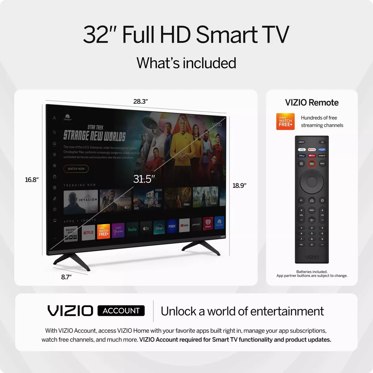 The VIZIO HD Smart TV ensures that streaming and gaming are easily integrated into smaller spaces and delivers seamless entertainment for every need. Built-in VIZIO Home lets you instantly access all your favorite apps, hundreds of free channels, thousands of free On Demand titles, and more. With an easy-to-use Home Screen and Active Pixel Tuning for true-to-life color, these TVs are the perfect solution for every other room in the house. Highlights The clarity you crave - Watch TV in crystal-clear 720p resolution enhanced by Full Array LED backlight and fine-tuned at a granular level with Active Pixel Tuning for vibrant color. Smart and easy - Enjoy instant access to the best selection of built-in apps from top tier streaming services and explore new apps as they are automatically added and updated. Stream 275+ free channels and 15,000+ movies and shows On Demand with the built-in WatchFree+ app. Bluetooth listening - Pair your Bluetooth headphones for uninterrupted listening, whether streaming your favorite show, playing a podcast, or blasting your top tunes. Stream faster - Dual-Band WiFi 5 seamlessly connects to your home internet for reliable speeds when streaming and launching your favorite shows. Your entertainment centerpiece - The modern 3-sided VIZIO ThinFrame design fits beautifully in any room. We get better with age - Supported VIZIO TVs can automatically update through WiFi with the latest apps, free channels, new features, and more. Smart home ready - You can stream, control, and share all your favorite movies, shows, music, photos and more from your Apple or Android devices directly to the TV with Apple AirPlay 2 and Chromecast. Integrates seamlessly with Apple Home, Google Assistant, and Amazon Alexa-enabled devices.
