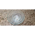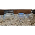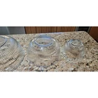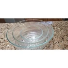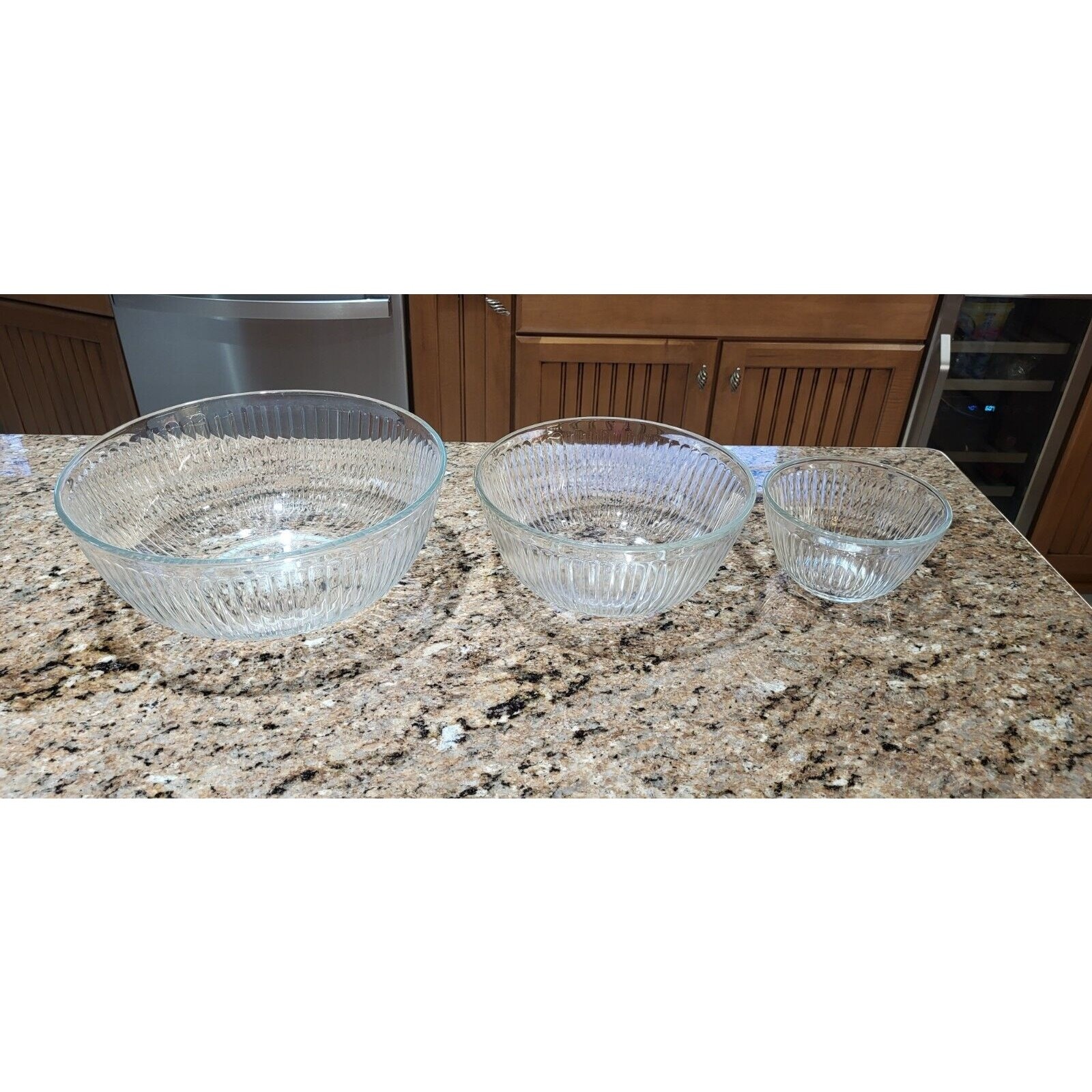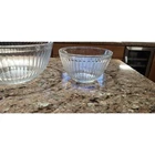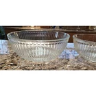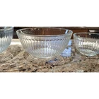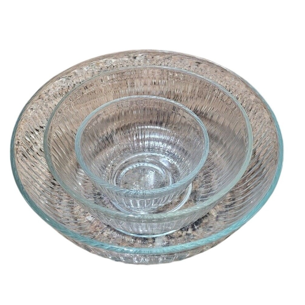 This vintage set of three Pyrex clear glass nesting/mixing bowls is a must-have for any kitchen. The ribbed design adds a touch of elegance while also providing a better grip when mixing ingredients. The bowls come in three different sizes (7401-S, 7402-S, and 7403-S) and are perfect for mixing, serving, and storing food. The bowls are made from high-quality glass and are durable enough to withstand daily use. The set includes a bowl set, making it perfect for those who love to cook and bake. The brand, Pyrex, is known for its quality and reliability, ensuring that these bowls will last for years to come. Add this vintage Pyrex bowl set to your collection today! Good condition set of bowls. The largest bowl has some scratches in the bottom of it as shown in the pictures. Other than that they have no chips.