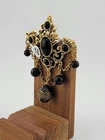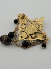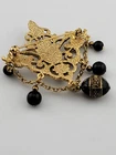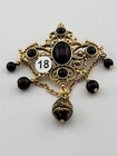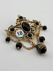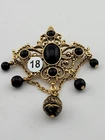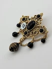 This vintage 1928 brooch is a stunning piece of jewelry that features a beautiful Victorian design, with black glass bead dangles and intricate openwork details. The yellow gold plated metal adds a touch of elegance to the piece, which would make a perfect addition to any collection. The brooch is crafted with natural black onyx as the main stone, with an oval shape that complements the black color of the glass beads. This item is pre-owned and has been well taken care of, with no visible damage or wear. It is a wonderful example of vintage and antique jewelry and would make a great gift for any woman who loves unique and timeless pieces.