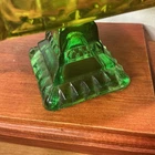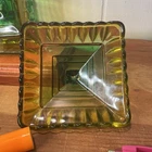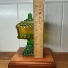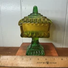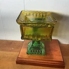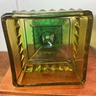 The VTG. 1930's Jeanette Glass Amber-Green-Flash Wedding Bowl is a vintage piece of depression glass that exudes a classic charm. Measuring 4" in length and width, and 6.5" in height, this square pedestal dish is perfect for special occasions like weddings or as decorative display pieces for all occasions. Made in America by Jeannette Glass in the early 20th century, this pressed glass bowl features a glossy finish and a lovely vintage green color. Its elegant design and original production make it a unique and cherished addition to any collection of pottery and glass.