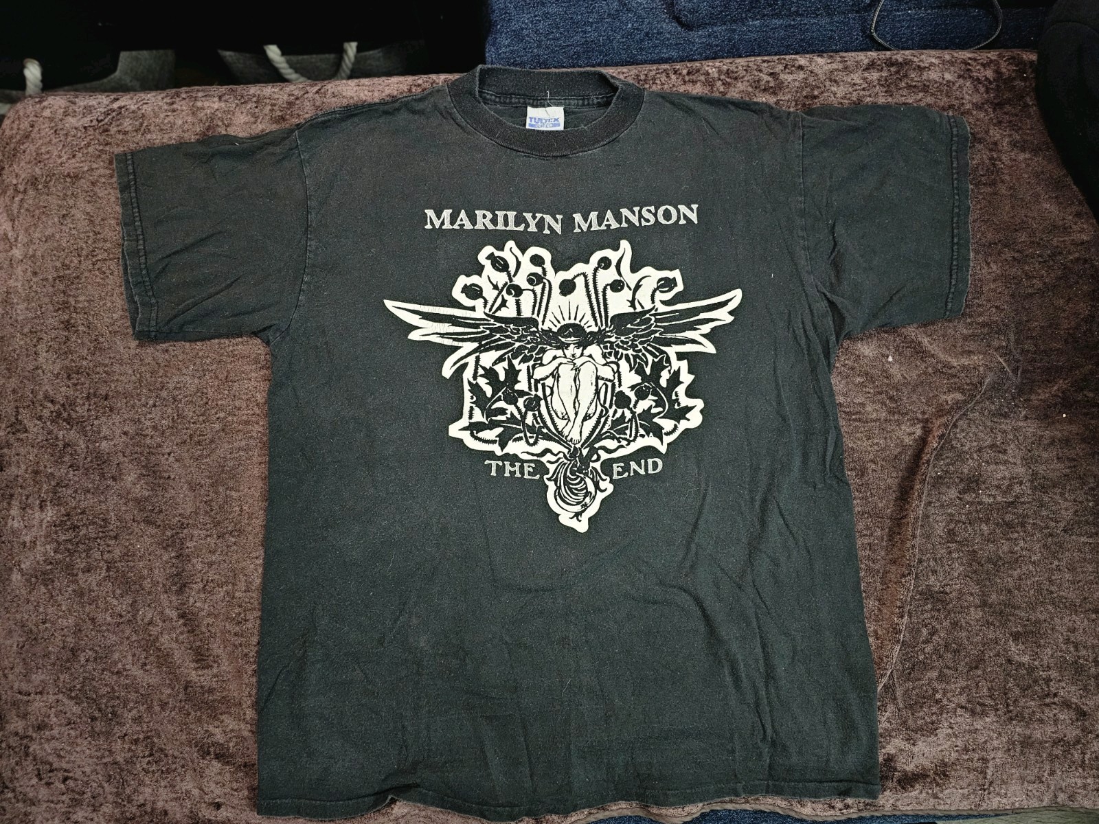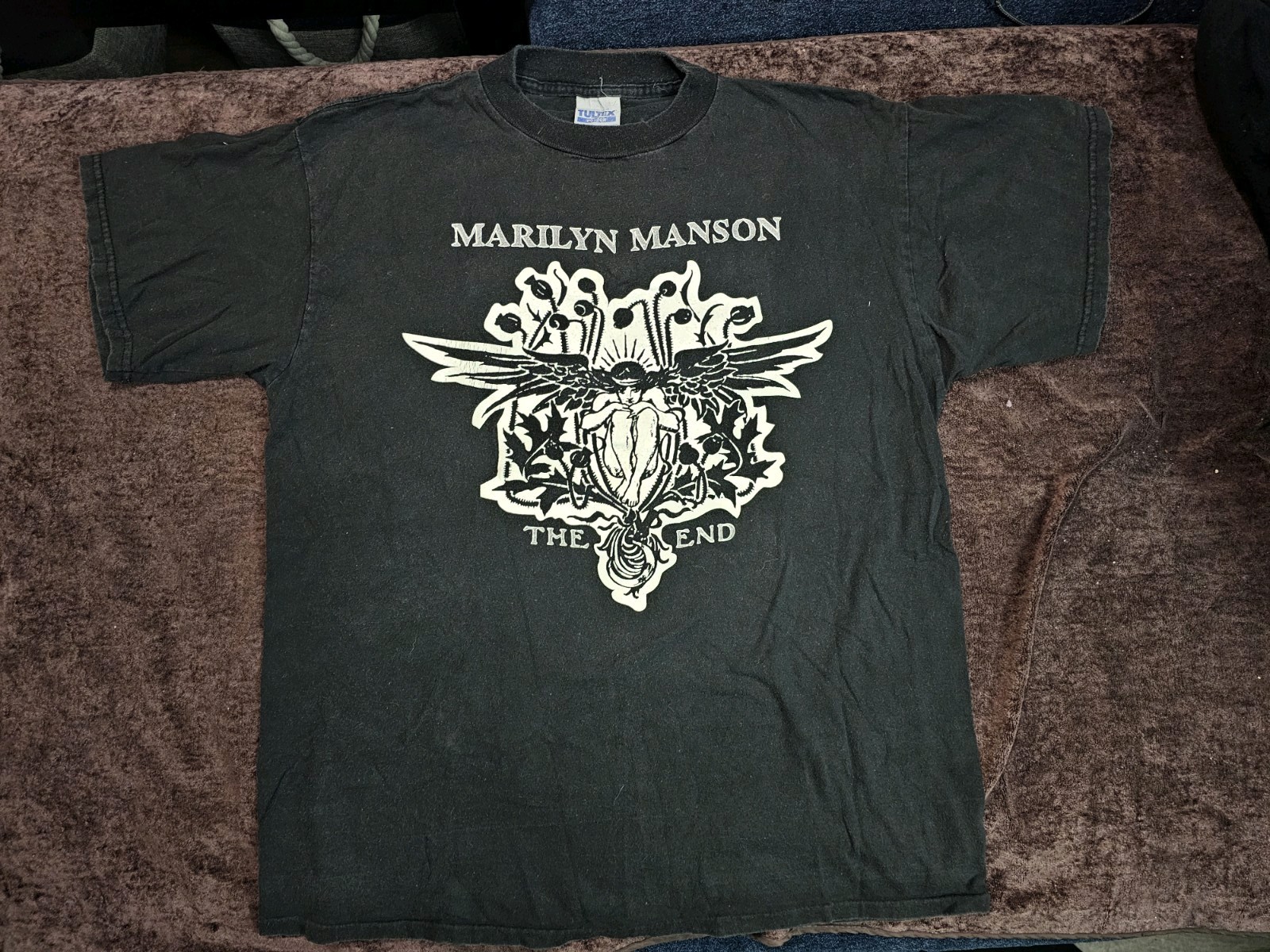 The VTG 1996 Marilyn Manson The End Tour T Shirt in XL is a vintage piece from the 90's featuring a solid black color with a crew neckline and short sleeves. Made of cotton, this machine washable shirt is a regular fit and is perfect for fans of rock, music, bands, and gothic culture. The Tultex brand adds a touch of authenticity to this iconic piece that captures the essence of Marilyn Manson's aesthetic at that time.