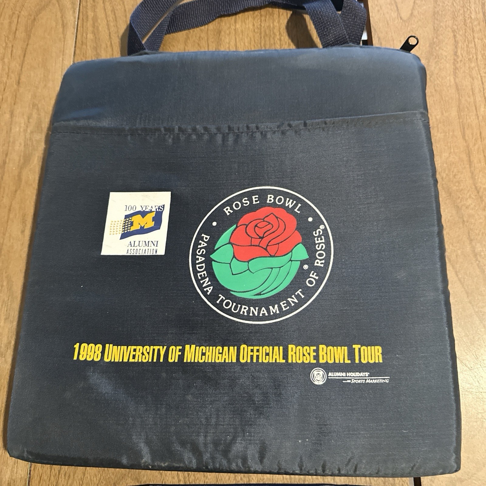 The product is a vintage 1998 Michigan Wolverines official Rose Bowl cushion and waterproof seat cover. This item is perfect for football fans of the Michigan Wolverines team, specifically designed for use during bowl games. Made for unisex adults, the cushion and seat cover come in a one-size-fits-all design. The waterproof cover ensures that your seat stays dry while you show off your team spirit at the game. Perfect for collectors or fans looking to commemorate their team's appearance in a bowl game.