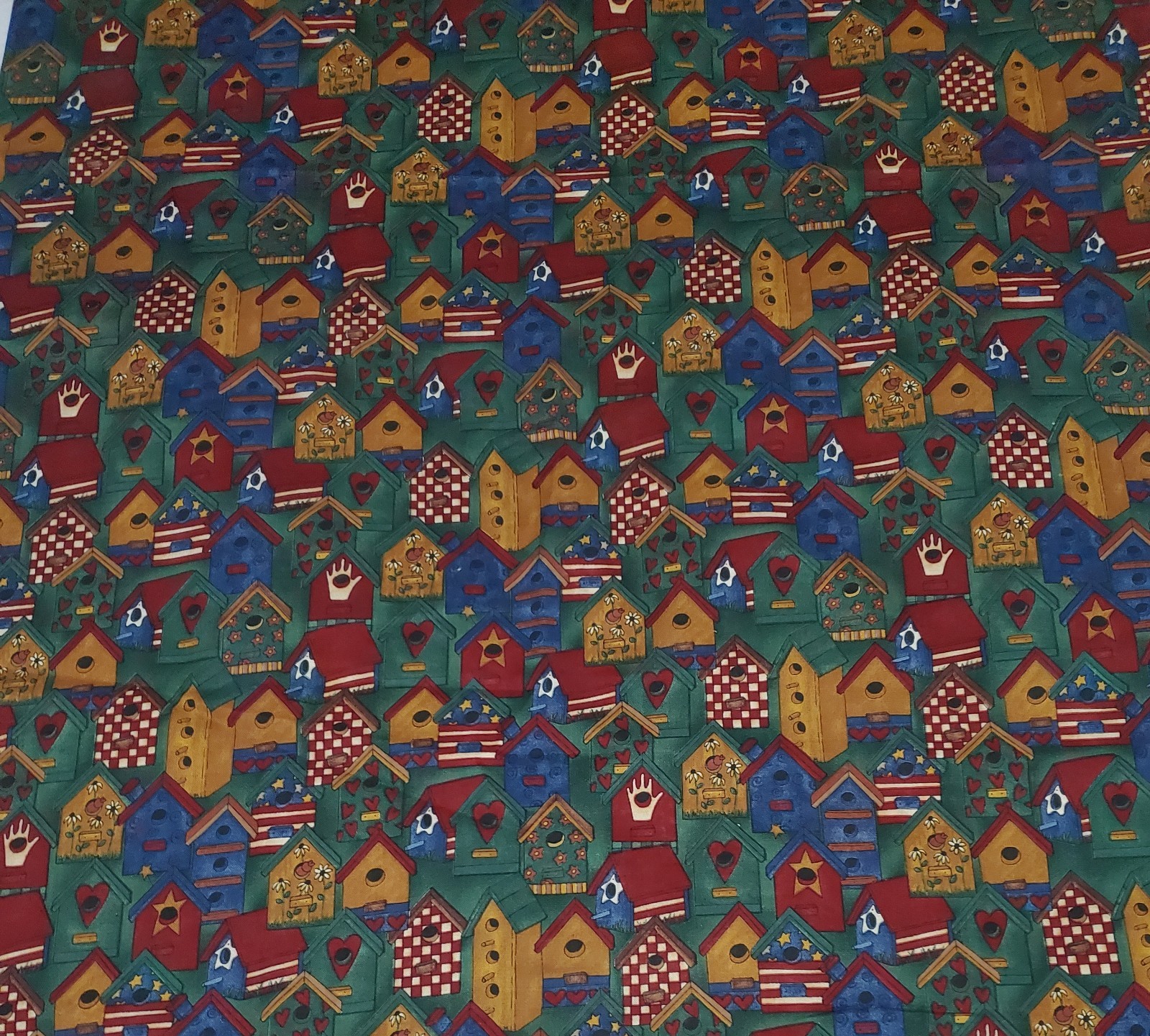 This is a beautiful, out-of-print cotton fabric from the "Small Friends" collection designed by Teresa Kogut for SSI, Inc. (South Sea Imports). The whimsical design features charming, colorful birdhouses in various rustic styles against a green background. Details: Designer: Teresa Kogut Collection: Small Friends Manufacturer: SSI, Inc. / South Sea Imports Material: 100% Cotton (Quilting Weight) Width: 44 inches Length: 73 inches (approx. 2.03 yards) Condition: New Old Stock, stored in a smoke-free home Perfect For: Quilting projects Crafting Home decor accents Collectors of Teresa Kogut designs A note on rarity: This collection is no longer in production and is considered hard to find. Don't miss the chance to add this unique fabric to your stash!