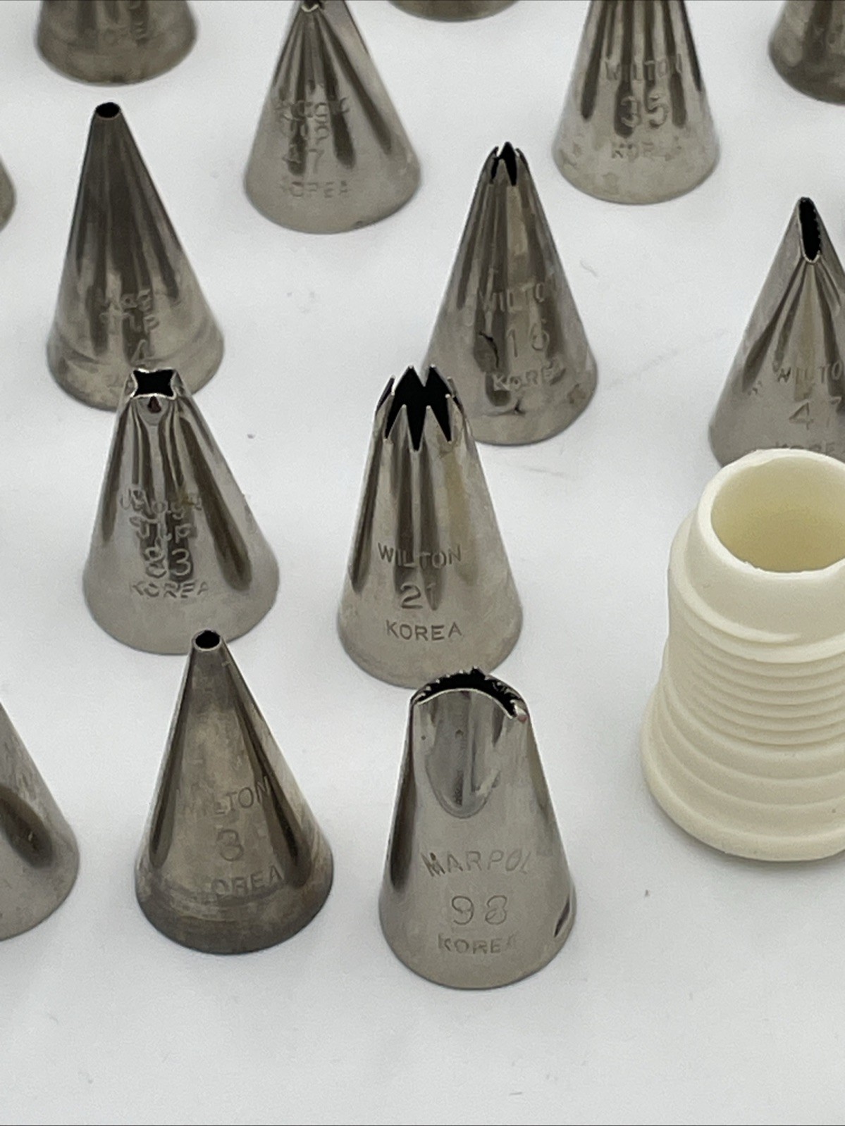 VTG 43pc Lot Wilton, Magic tips, Marpol/mixed Stainless Cake Decorating Tips/misc Korea B1 All are used and show minor wear/some need cleaning, minor marks. Check pictures to judge condition no returns Message me with any questions thanks