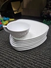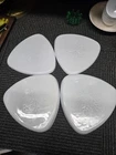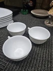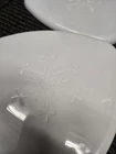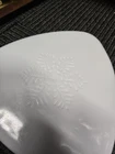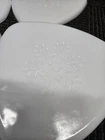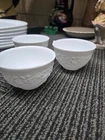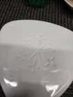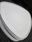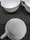 This vintage set includes a triangular milk glass snack plate and three tea cups, featuring a white floral leaf pattern with an embossed design and snow flake designs on the back. The Victorian-style pieces have a glossy finish and were produced in the mid-20th century, specifically between 1960-1969. These items are an original production style of milk glass, adding a touch of vintage charm to any table setting.