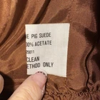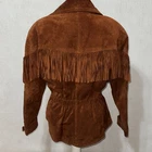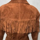 The VTG 70s Leather Suede Women's Fringe Jacket in Caramel Brown is a vintage piece with a unique hippie western boho style. Made of suede leather with a polyester lining, this mid-length jacket features a button closure, fringes, and various accents such as padded shoulders and elastic waist. The warm caramel color adds to the retro charm, making it suitable for all seasons and occasions. The jacket also includes pockets and is designed with a regular fit for comfort. Perfect for those who appreciate classic bohemian and cowboy themes from the 70s and 90s. MEASUREMENTS AS FOLLOWS PIT TOPIT 20” Drop from waist to bottom hem 9” Made in Slovenia