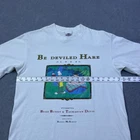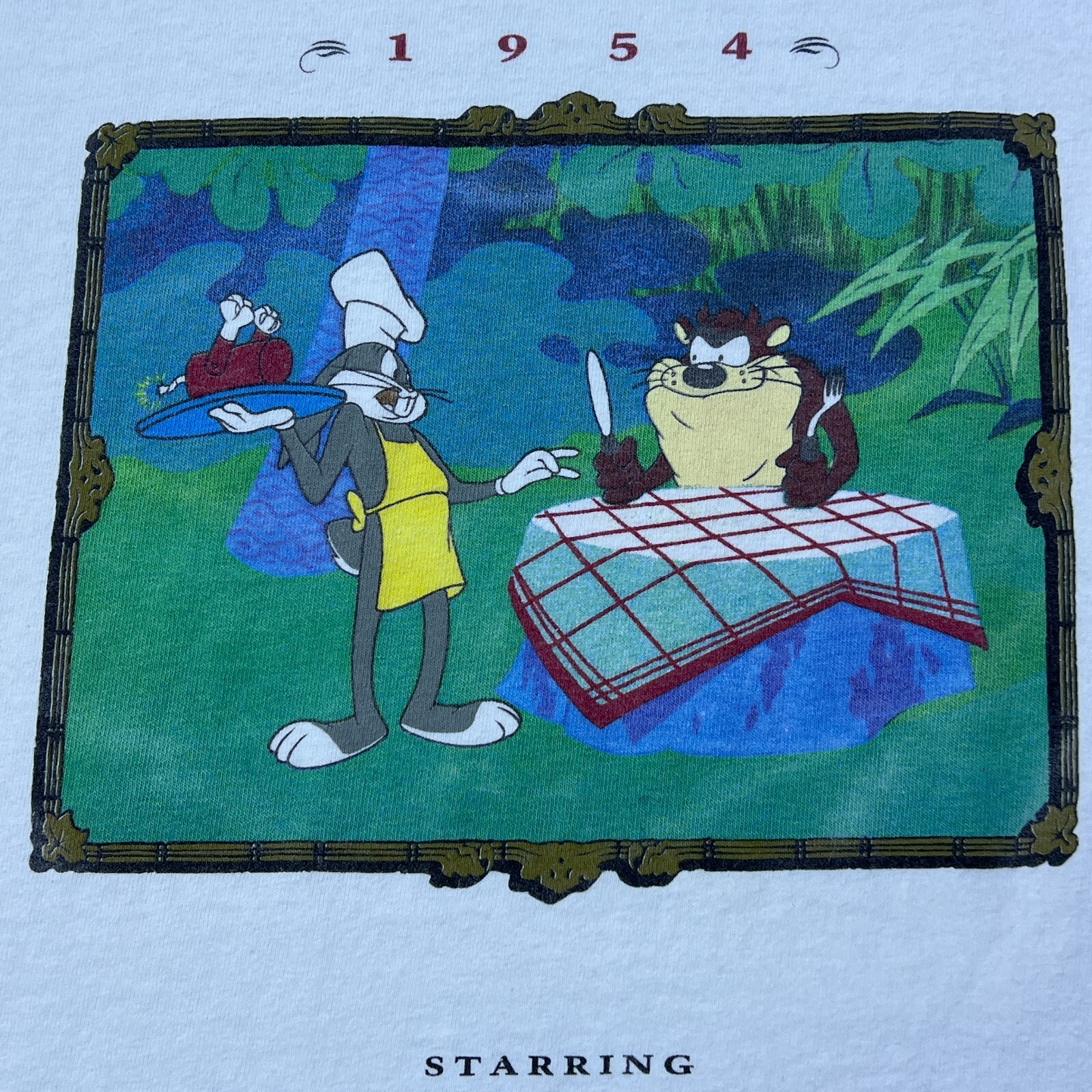 This vintage Bugs Bunny and Tasmanian Devil shirt is a must-have for any cartoon fan! The single-stitch USA-made tee has that classic retro feel, though it shows some wear as expected with pre-loved items. The print is still vibrant, and the fit is true to its era—just double-check measurements since sizing can vary. Cool lighting in pics might slightly alter colors, but the charm is 100% real. A fun, nostalgic piece with character!