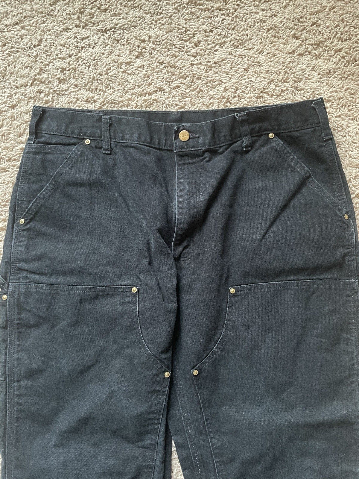 The VTG Carhartt B01 BLK Double Knee Carpenter Pants in size 38x28 are perfect for those who appreciate vintage style and quality construction. Made from 100% cotton canvas, these classic fit pants feature a solid black color with a button closure. The double knee design adds durability and a touch of Americana flair, making them a timeless wardrobe staple for any man looking for a rugged yet stylish look.