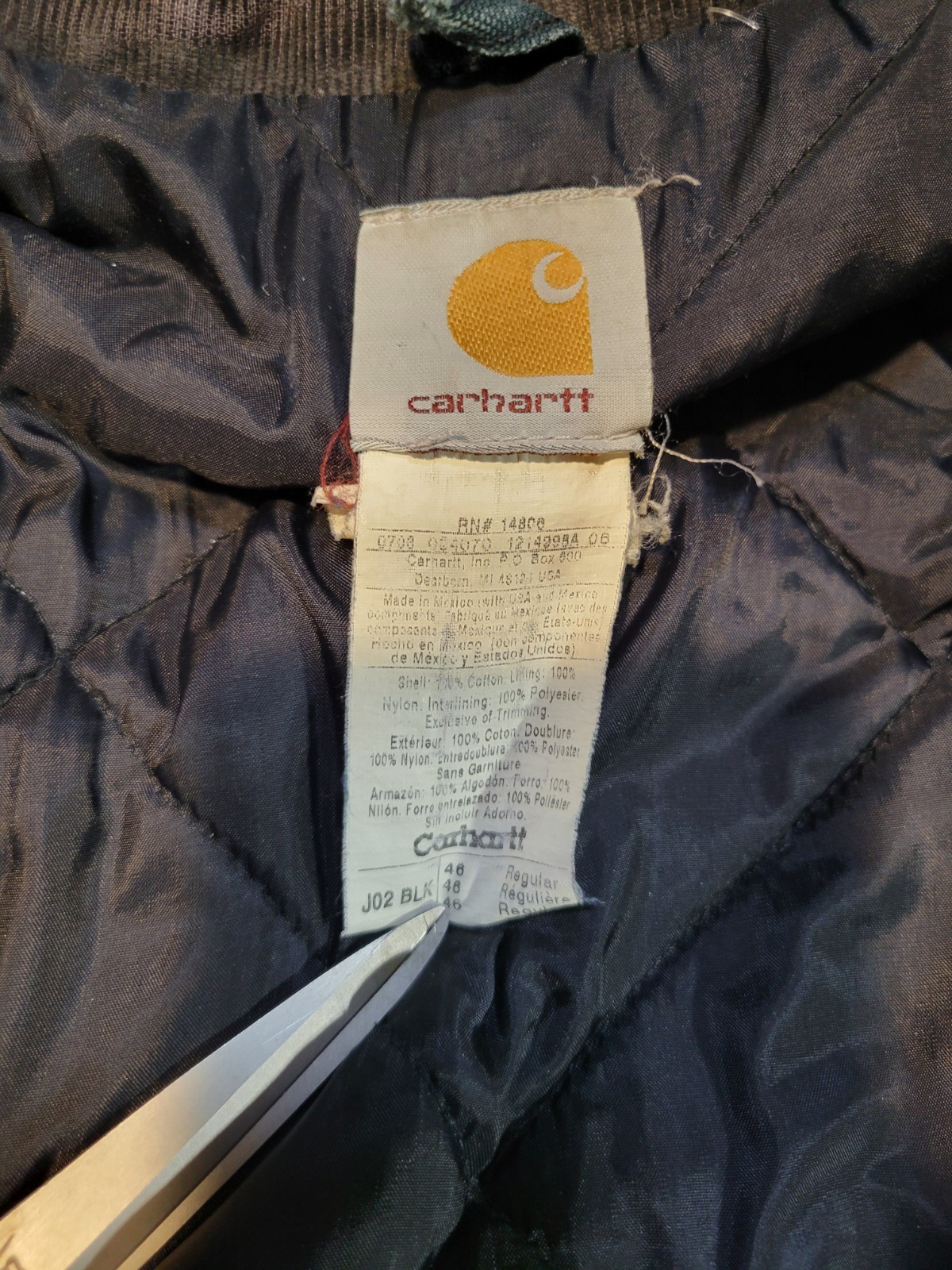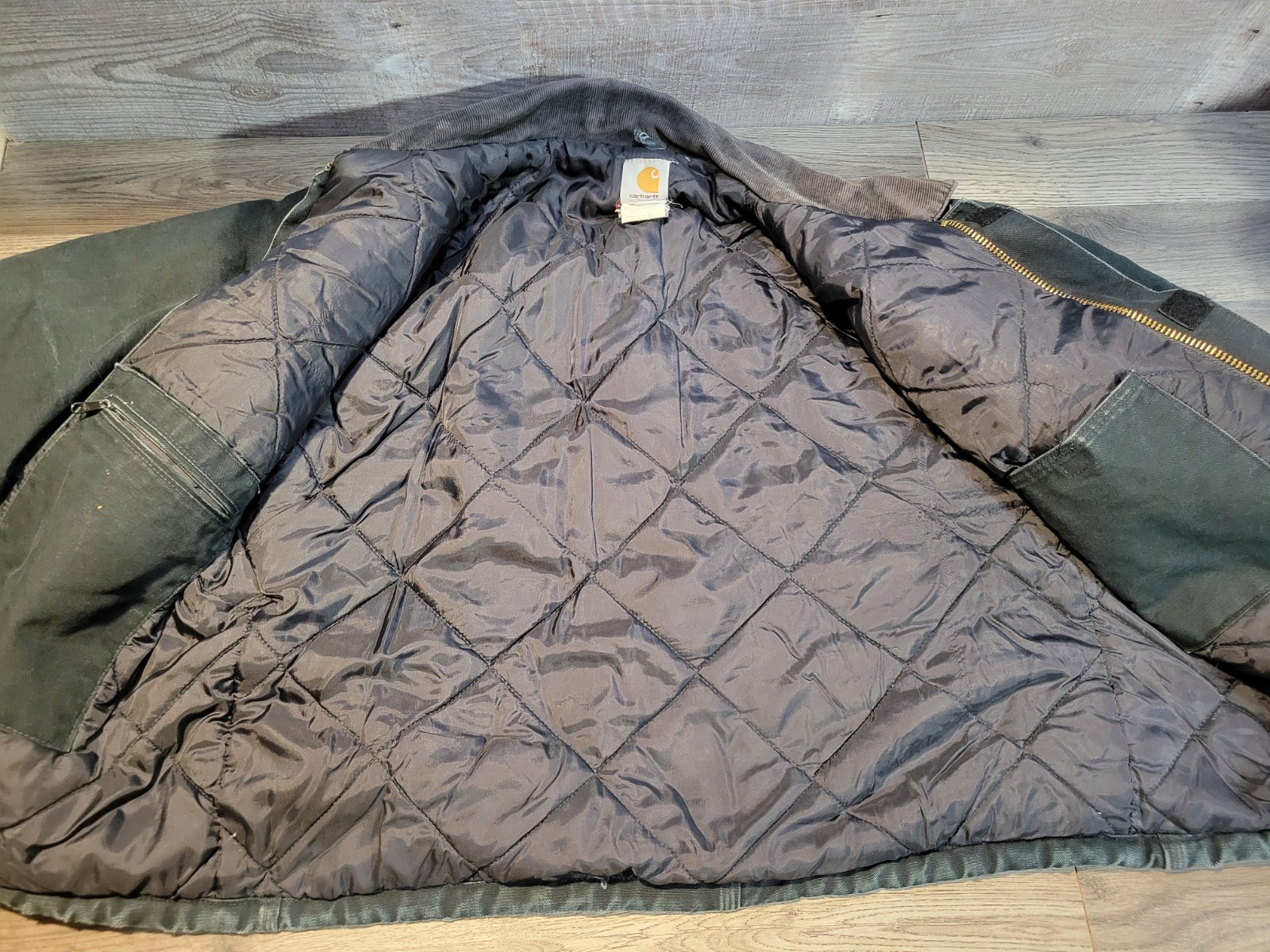 Vintage 90s Carhartt J02 BLK Arctic Work Jacket Coat. Quilt-Lined, brown corduroy collar. Distressed appearance, nice fade with multiple holes and tearing, see pictures. Size 46 Regular, measures approx 25 1/2" chest x 25" length. Please use measurements provided for approximate size.