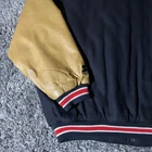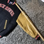This is a vintage Chicago Blackhawks Starter Letterman Jacket in size XL for men, featuring leather sleeves. The jacket is officially licensed by the National Hockey League (NHL) and displays the team's branding prominently. Made in Indonesia, this multi-color jacket is a fan favorite for hockey enthusiasts wanting to show their support for the Chicago Blackhawks in style. The jacket is in excellent used condition, perfect for any fan looking to add a retro touch to their game day attire. Seller owned from original- worn only a few times, stored and kept clean over the years. Excellent vintage jacket/coat- purchased in the 90’s.