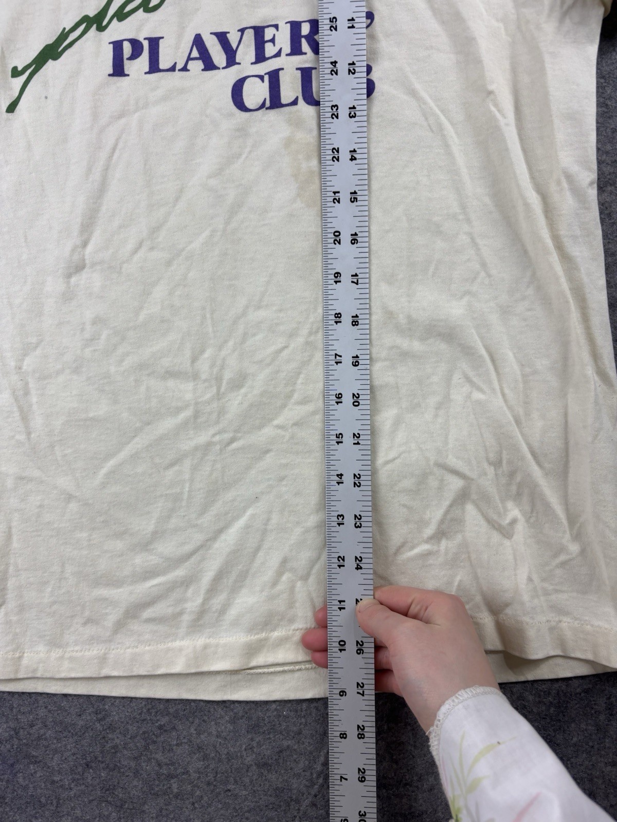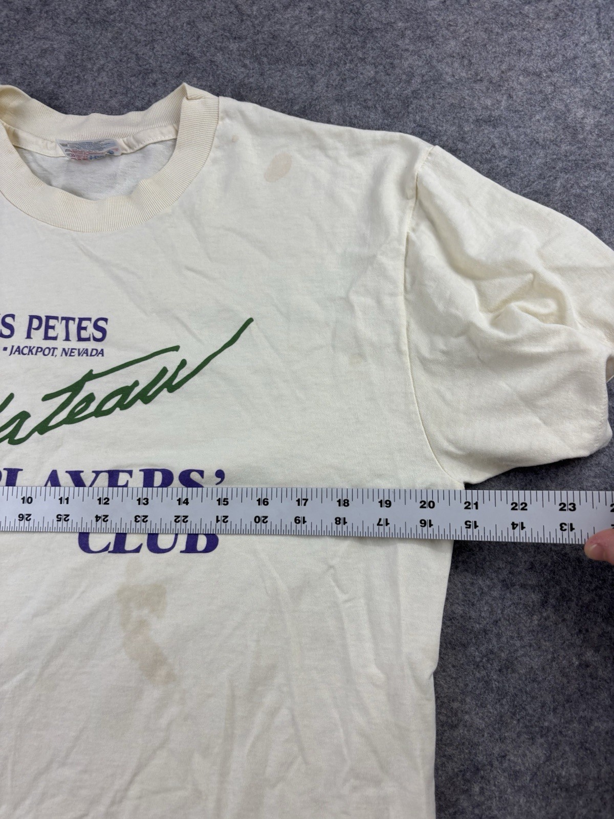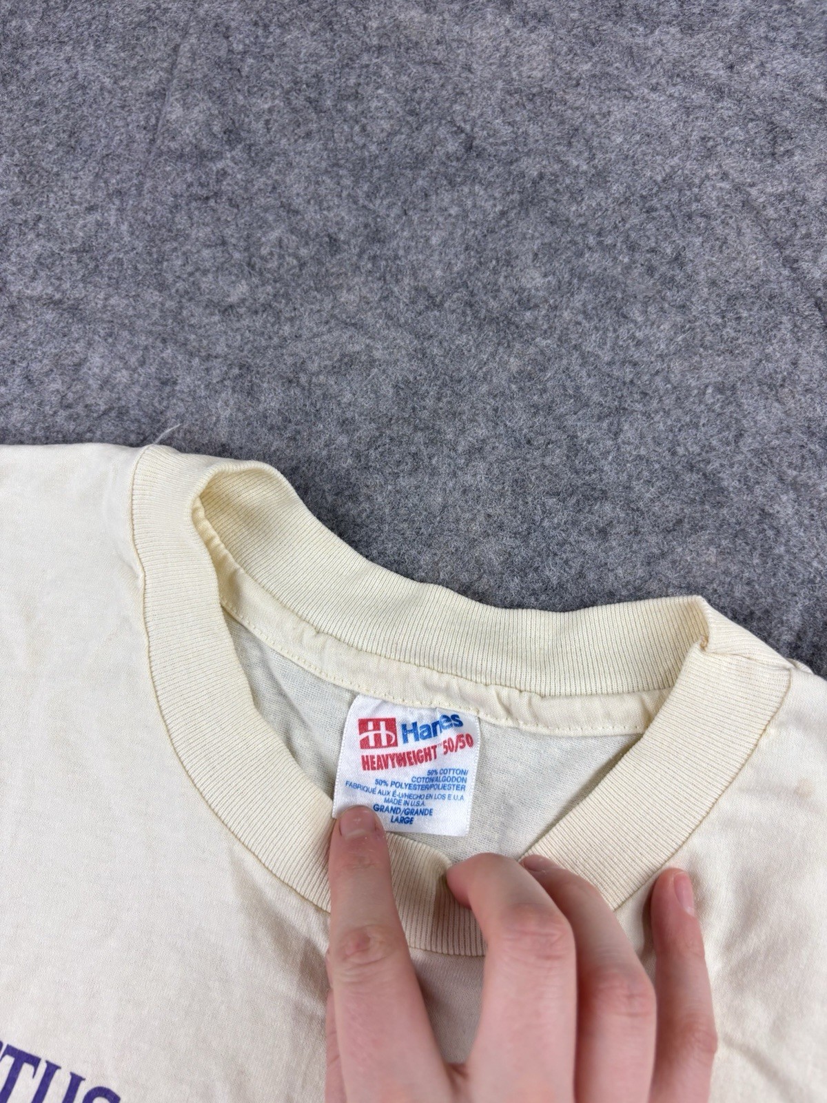 See stains** The VTG 90s Hanes Heavyweight 50/50 Single Stitch Cactus Petes Casino Players Club T-Shirt is a vintage piece featuring a graphic print design with a sailboat motif. Made of cotton material and manufactured between 1990-1999, this beige shirt is machine washable and has a crew neckline with short sleeves. The regular fit and size L make it a comfortable and classic addition to any 90s-themed wardrobe. Made in the United States by the Hanes brand, this T-shirt is a unique and stylish choice for any man looking to add a retro touch to his outfit.