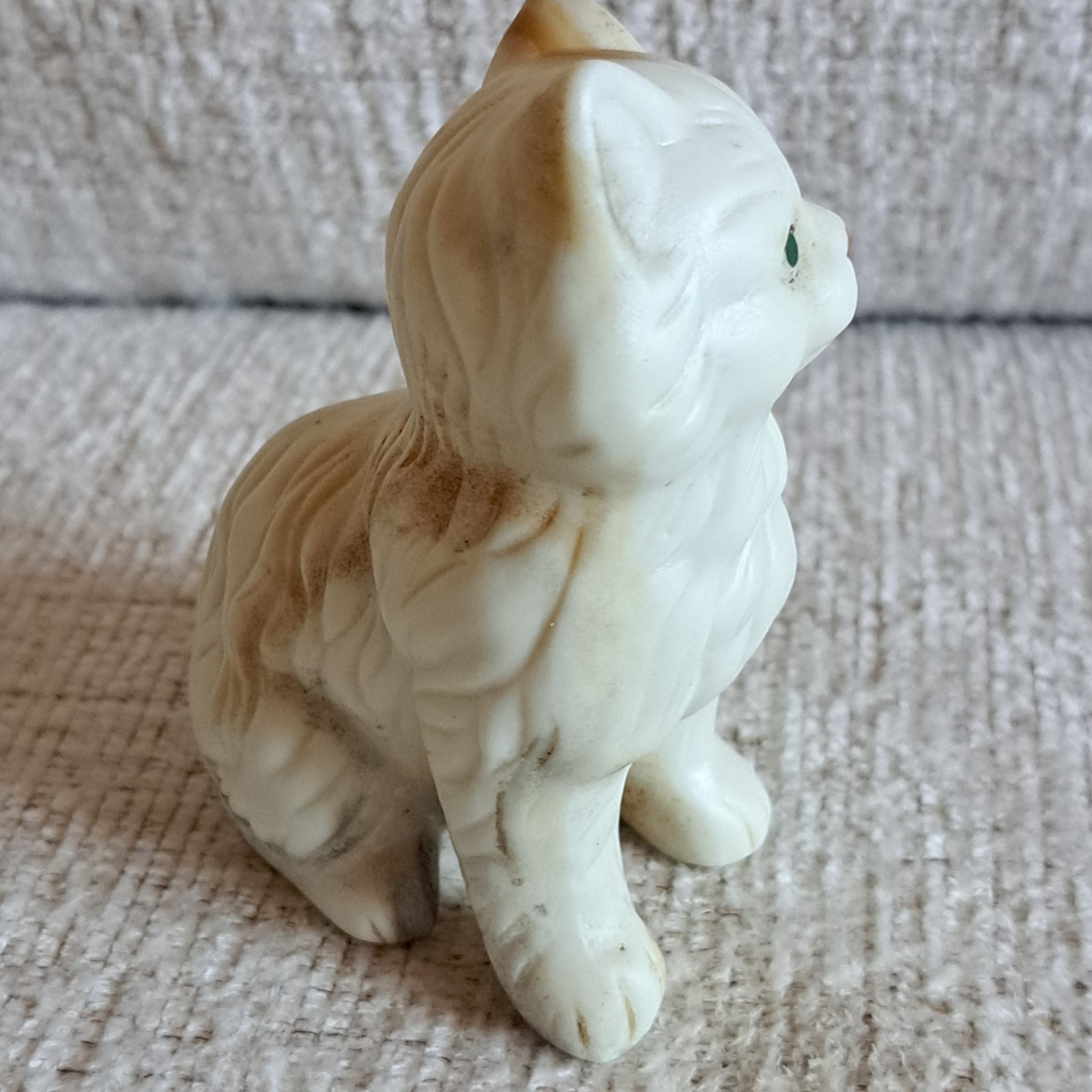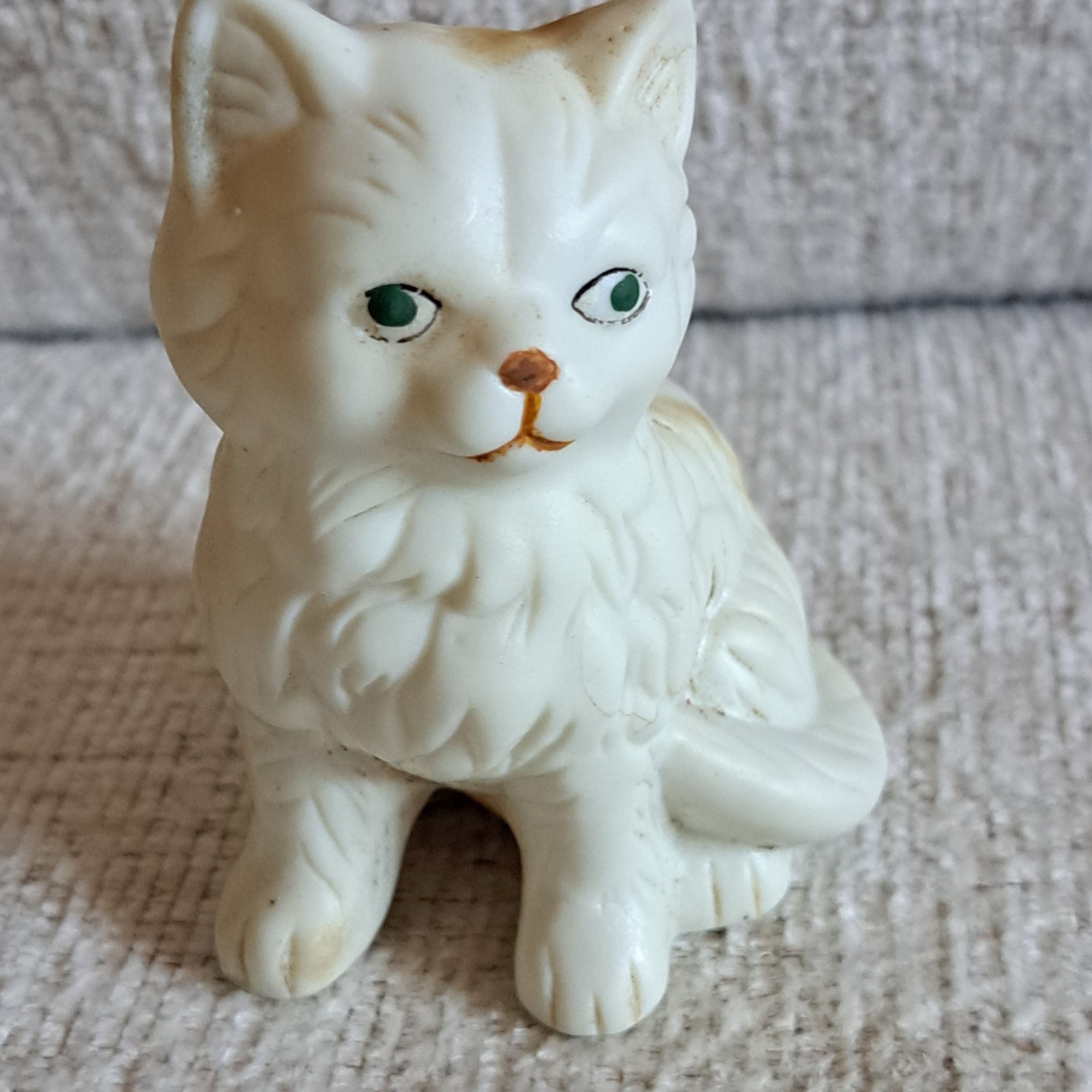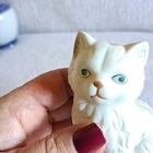 This 4" ceramic figurine features a vintage 90s design of a kitten cat with striking green eyes. Perfect for cat lovers and collectors, this pre-loved piece adds a charming and nostalgic touch to any decor. The adorable portrayal of the feline with its unique green eyes makes it a standout piece for any cat enthusiast's collection. Very good condition with no cracks or chips.