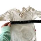 A white long sleeve baby girls bodysuit featuring a heart embroidered with colorful flowers on the front and a sweet Minnie Mouse graphic on the sleeve. This charming one-piece includes a ruffled neckline and cuffs for a touch of sweetness. Perfect for everyday wear or special occasions. Measurements: • Chest: 9 in • Length: 16 in • Sleeve Length: 12 in Department: Unisex Baby & Toddler Style: Onesie Character: Minnie Mouse, Heart Theme: Heart, Disney Character Family: Mickey & Friends Fabric Type: Knit Set Includes: Bodysuit Pattern: Floral Material: 100% Cotton, Cotton Number of Pieces: 1 Piece Occasion: Casual Features: Easy Care, Textured Keywords: Disney, Minnie Mouse, baby girl, onesie, bodysuit, long sleeve, floral, embroidered, ruffle, cute, character, apparel, clothing, infant All items come from a smoke free, golden retriever dog friendly home. All of items unless NWT or Dry Clean Only are washed with Tide. We try our best to disclose any flaws with items, if we miss something please reach out and let us know.