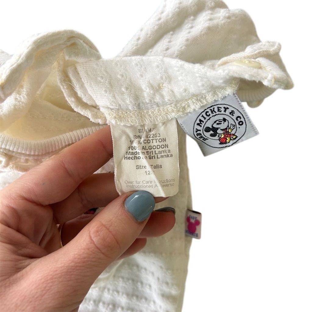 Neckline: Round Neck Style: Onesie Brand: Baby Mickey & Co Size: 12-18 Months Occasion: Casual Department: Girls Accents: Embroidered, Ruffle Character: Minnie Mouse, Heart Character Family: Mickey & Friends Vintage: Yes Garment Care: Machine Washable Color: Multicolor Number of Pieces: 1 Piece Season: Spring, Fall Material: 100% Cotton, Cotton Personalize: No UPC: Does not apply Set Includes: Bodysuit Sleeve Length: Long Sleeve Theme: Heart, Disney gtin13: Does not apply Pattern: Floral Closure: Snap Features: Easy Care, Textured Type: One-Piece Handmade: No Country of Origin: Sri Lanka Fabric Type: Knit