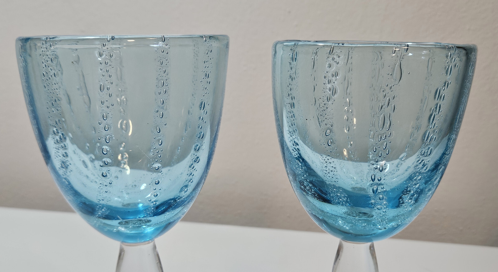This vintage pair of bubble glass aqua blue wine glasses with clear stems standing at 8 inches tall is a unique addition to any dining or bar collection. The novelty design features a contemporary style with a Spring/Summer theme, making them standout pieces. Made of glass and hand wash only, these wine glasses are perfect for serving 2 guests in a stylish and elegant manner. Add a touch of vintage charm to your home with this eye-catching set of wine glasses.