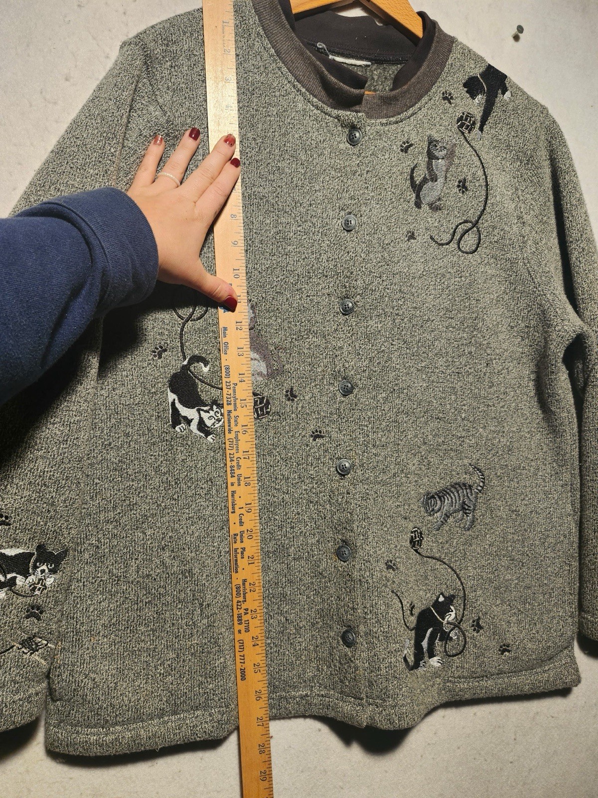 Wonderful, whimsical gray cardigan all over playful kittens design. Does not have a size tag, however, the dimensions are approximately extra large. Please see all pics. All measurements are in pictures. Ships the next business day after our payment.😊