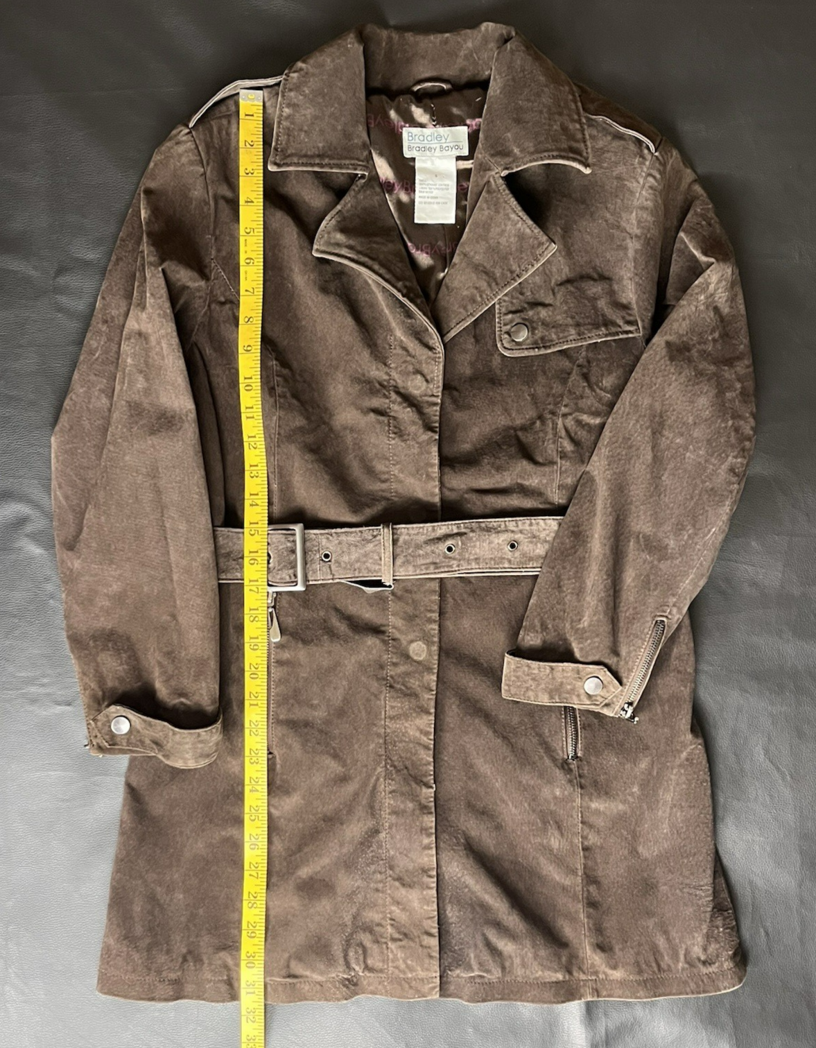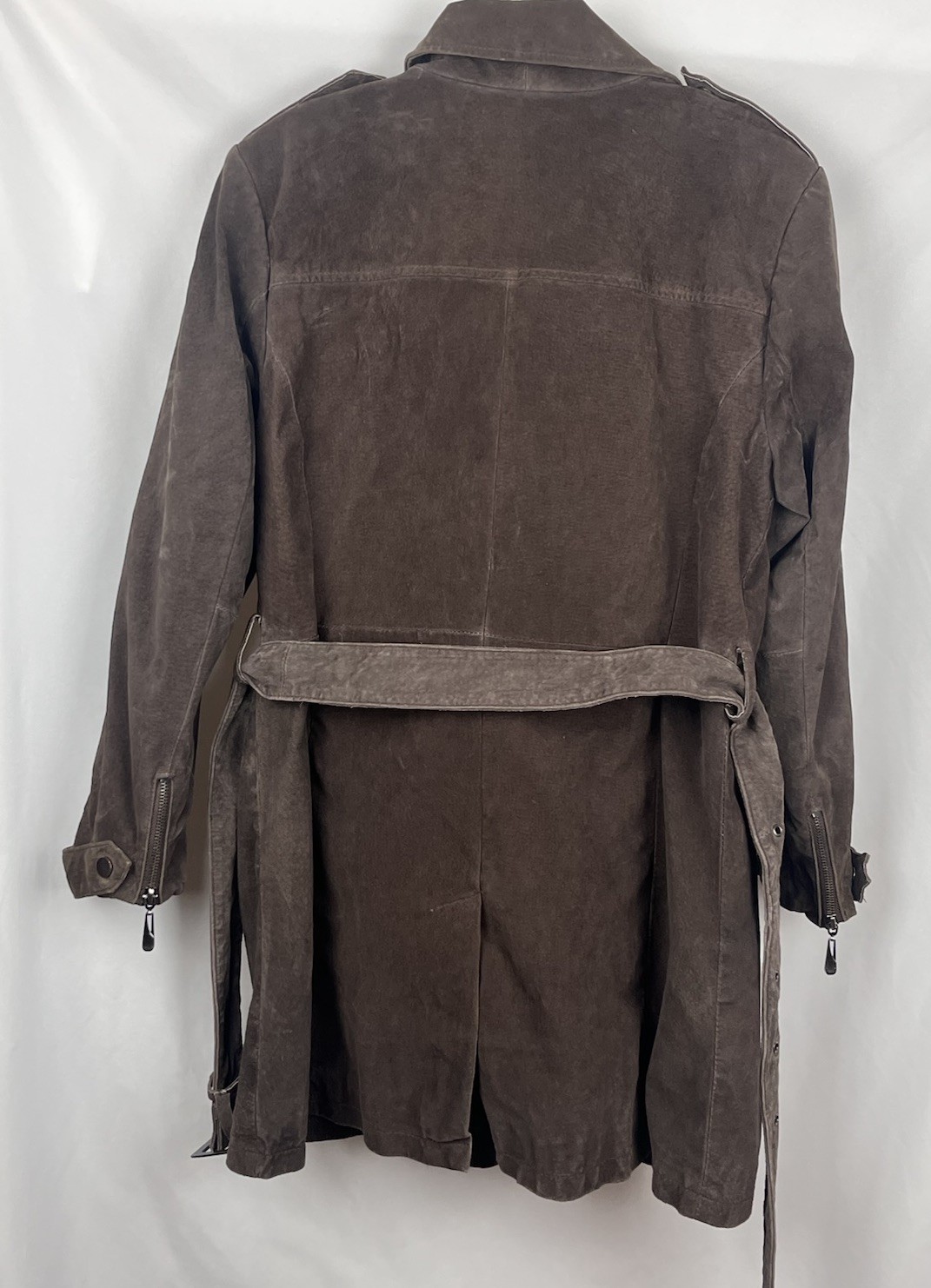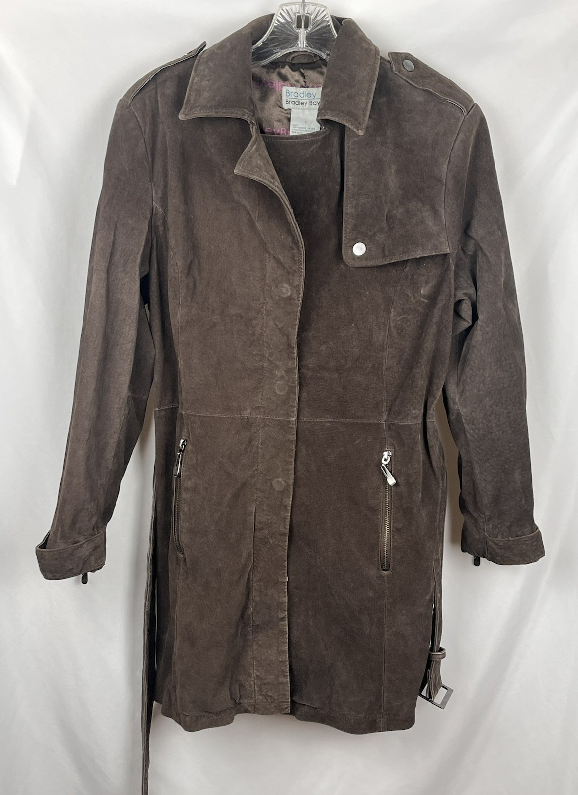 *PLEASE REFER TO THE PHOTOS FOR MEASUREMENTS. OFFERS ARE WELCOME, AND WE ARE HAPPY TO PROVIDE ADDITIONAL PICTURES OR MEASUREMENTS UPON REQUEST.* THANK YOU! CONDITION: THIS ITEM IS IN GREAT PREOWNED VINTAGE CONDITION. THE SUEDE HAS NATURAL VARIATIONS AND LIGHT DISTRESSING CONSISTENT WITH GENUINE LEATHER AND AGE, GIVING IT A DESIRABLE BROKEN-IN CHARACTER. ALL HARDWARE IS FUNCTIONAL. PLEASE REVIEW ALL PHOTOS CAREFULLY AS THEY FORM PART OF THE CONDITION DESCRIPTION. Description: Stunning Vintage Bradley Bayou Suede Leather Trench/Moto Jacket in a rich brown color. This piece merges the classic structure of a trench coat with edgy moto/biker details, crafted from 100% genuine suede leather and lined with a smooth, printed polyester satin.