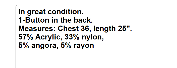 In great condition. 1-Button in the back. Measures: Chest 36, length 25". 57% Acrylic, 33% nylon, 5% angora, 5% rayon We are so thankful for our customers! We have thousands of listings, and therefore receive hundreds of messages, every single day. So, if you are asking about a price drop, or a shipping price drop, or asking for extra measurements, or to add additional photos, please allow me to answer you here, No thanks. If your question is not one of those questions, we will be happy to answer you individually. YES...WE DO COMBINE DOMESTIC SHIPPING. Extra jewelry items ship for $2 each (except for large jewelry lots). We will refund the difference as we are mailing out.....we hope you enjoy shopping with us!