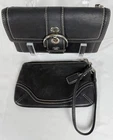 πππ VINTAGE COACH Black LARGE Soho EAST WEST LEATHER Tote, Double Front Phone Pockets with Coach Signature Magnetic Snap Closure, 3 Pieces: TOTE, WALLET AND WRISTLETβ3 PIECE COMBO #6468 It is RARE TO HAVE THE 3 MATCHING PIECES. Preloved:EXCELLENT CONDITION. PLEASE SEE PICTURES. TOTE: This is the Large Vintage Coach SOHO EAST WEST TOTE. It is a black leather tote bag with a large size, rectangular shape, and double front phone pockets (PHONE, keys or glasses, etc). It features white stitching, silver hardware, double handles, a COACH Hangtag Charm and a zip closure. The bag is designed for various occasions including travel, weddings, parties, casual wear, workwear, and business meetings. It includes inner and outer pockets, is water resistant and lined. The limited edition design includes double leather shoulder straps and side snap expanders, making it a stylish and practical choice. The expanders make this the perfect Tote for the office, traveling or for everyday use. You will enjoy this bag for years to come. Great gift set. WALLET: The Vintage Coach SOHO EAST WEST WALLET has the signature Magnetic Buckle Close. It is a tri-fold with 12 ID & Credit Card pockets, 3 Cash pockets, a pocket on the first fold and an outside zipper pocket for change. Size: 7.5β X 4.25βclosed and 10.75 X 7.5β opened. Preloved Excellent Condition. WRISTLET: The small Wristlet is perfect for your ID, a Credit Card and some cash to lighten your load. It has a COACH Hangtag Charm. It would also be perfect for a charging cable or iPods. Size: 6.5β X 4β, Strap is 6β. Preloved Excellent Condition. ***PLEASE LOOK AT ALL OF OUR PICTURES FOR CONDITION, MATERIALS AND MEASUREMENTS. **Props are not included like phones, bags, mannequins (or her clothes), etc. ***WE GUARANTEE THAT OUR ITEMS ARE AUTHENTIC OR WE GIVE YOU YOUR MONEY BACK. We clean and recondition every bag and we ship our purses in boxes to protect them. A Preloved bag may have signs of wear so please see all of the pictures. *** We combine shipping to save you money on multiple items that are SHIPPED TOGETHER. You pay the highest shipping on one item and the next three items are $1.50 shipping per item. The 5th item will start the cycle again. We hope this helps you. π Inventory #0082/1025 THANK YOU FOR CONSIDERING OUR ITEMS AND PLEASE CHECK OUT OUR EBAY STORE - ebay.com/str/morinfashions ***Please add us to your list of βFavorite EBay Storesβ. Just click the Heart next to Morin Fashions so you can find us again! π We are not affiliated with or represent any other company than Morin Fashions. Thanks Again, HAVE A BLESSED DAY! πππ ebay.com/str/morinfashions (List us under Purses in your contacts)