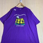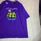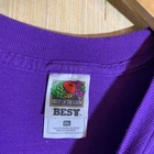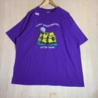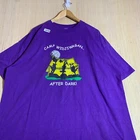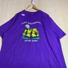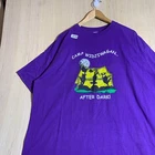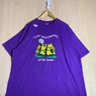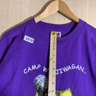 This vintage Fruit of the Loom T-shirt in size 2XL features a graphic print of Camp Widjiwagan in purple, made of cotton knit fabric. The shirt has a crew neck and short sleeves, with a regular fit suitable for men. It exudes a hipster, nature-inspired vibe and is perfect for various themes like motorcycle, hippie, and university styles. Additionally, the T-shirt is easy to care for, pre-shrunk, and suitable for all seasons, making it a versatile and comfortable choice for any wardrobe.