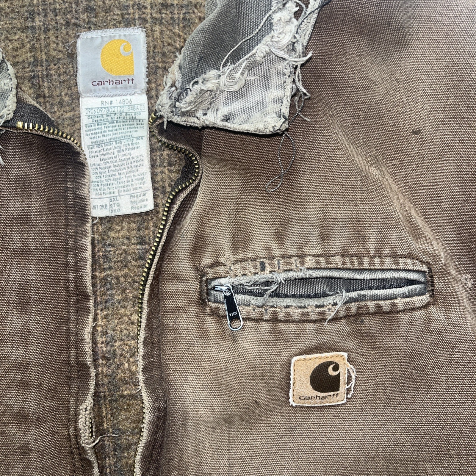 The Vintage Carhartt J97 Dkb Detroit Jacket is a stylish and durable outerwear piece for men. Made of cotton canvas with a solid brown color, this bomber jacket features a zip closure and is lined for added warmth. Carhartt, a well-known brand in the USA, adds a touch of authenticity with its logo accents. Perfect for casual or workwear occasions, this regular fit jacket in size M is a versatile addition to any wardrobe, embodying a classic American aesthetic.