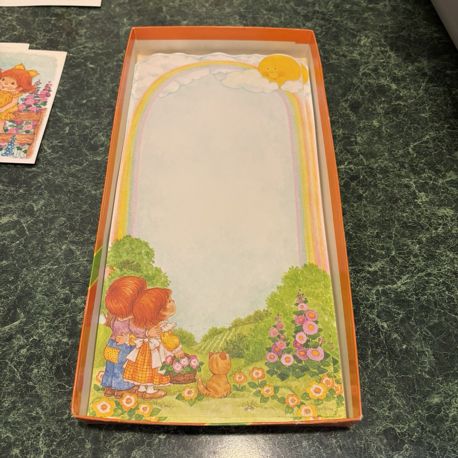 This VTG Current Stationery Set offers a variety of note cards, paper greeting cards, and stickers all made in the United States. Perfect for collectors or those looking to add a touch of vintage charm to their stationery collection. The set includes a range of designs and styles to suit different tastes and preferences, making it a versatile option for crafting and correspondence. Some missing items, but comes with everything pictured.