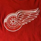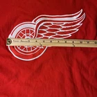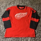 The product is a vintage Detroit Red Wings long sleeve shirt in size large, featuring an embroidered team logo. It is officially licensed by the National Hockey League (NHL) and designed for unisex adults. The shirt is in excellent used condition and is colored red, representing the team's colors. This fan apparel item is a great addition to any Detroit Red Wings supporter's collection, perfect for showing team pride during the regular NHL season.