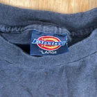 This is a vintage Dickies long sleeve tee in size L for men. It is made of 100% cotton canvas fabric with a round neck and features a center chest screen printed graphic. The black shirt has a retro 90s style and is suitable for all seasons. It is branded with the Dickies logo and is tagless for comfort. Perfect for a classic, outdoor, or sporty look. SKU: LG-28-83