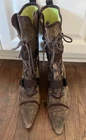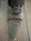 Step out in style with these Diesel Vintage Everest Pointed Toe Lace Up Grunge Heeled Boots. These boots are sure to make a statement! The boots feature a mid-calf shoe shaft style, pointed toe, and lace-up closure for a comfortable and secure fit. The suede upper material is accented with a strap, laces and zipper, giving the boots a unique look. The boots have a rubber outsole for durability and a fabric lining for added comfort. The kitten heel style adds a touch of sophistication to the overall grunge look. These boots are perfect for winter, fall, and spring seasons. Available in size 9.5 US and 40.5 EU. There is some discoloration on the inside of the boots, but they are in very nice condition from the outside. The sole and heel show little to no wear.