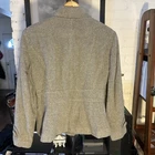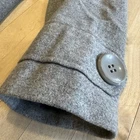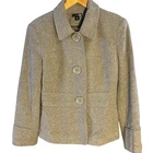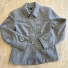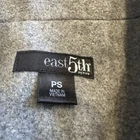 This is a vintage East 5th women's petite small wool blend jacket peacoat in gray. It features a mid-length with long sleeves, oversized button closure, lined interior,shoulder pads , and classic fit. The jacket is designed with a preppy academia style, making it ideal for fall and winter seasons. It is suitable for those who appreciate geek, retro, hipster, and designer themes.