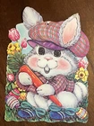 VTG Easter Bunny holding a carrot in a dress jacket and cap. Paper Wall Decor USA 15” Mid Century . Condition is Used. Shipped with USPS Media Mail.