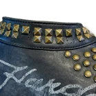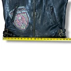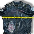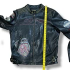 Ed Hardy Moto Jacket Unisex Black Leather Mini Skirt Mob Studded Sz L (W) M (M) This unisex black leather jacket from Ed Hardy combines biker style with a touch of glam. Made with premium leather and adorned with studded and patch detailing, this jacket is perfect for standing out in any crowd. Whether you're on a motorcycle or just want to add some edge to your wardrobe, this black moto jacket is a must-have. The jacket is in Good vintage condition and ready to wear. There are some missing studs on the collar/shoulder, as well as some verdigris and torn patches. There is also one sewn area in the right exterior armpit. NOTE: The size tag is missing so please review the measurements. ~Size - L (w) M (m)
