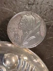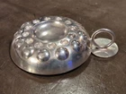 VTG European Silver Plate Wine Tester Tasting Porringer Cup w/ Thumb Rest Sommelier Beautiful antique piece of European origin, Unidentified maker. Early Classic design. Remarkable workmanship with hammered detailing in a bubble & wave design & fantastic finger loop thumb rest handle adorned with portrait of a female with a royal appearance sipping some wine. Lovely addition to any early wine taster collection. Sommelier / wine tester cup. Condition is consistent with age. Some minor oxidation present Measures 4" inches in Length, 1" inch in Tall x 3" inches in Diameter