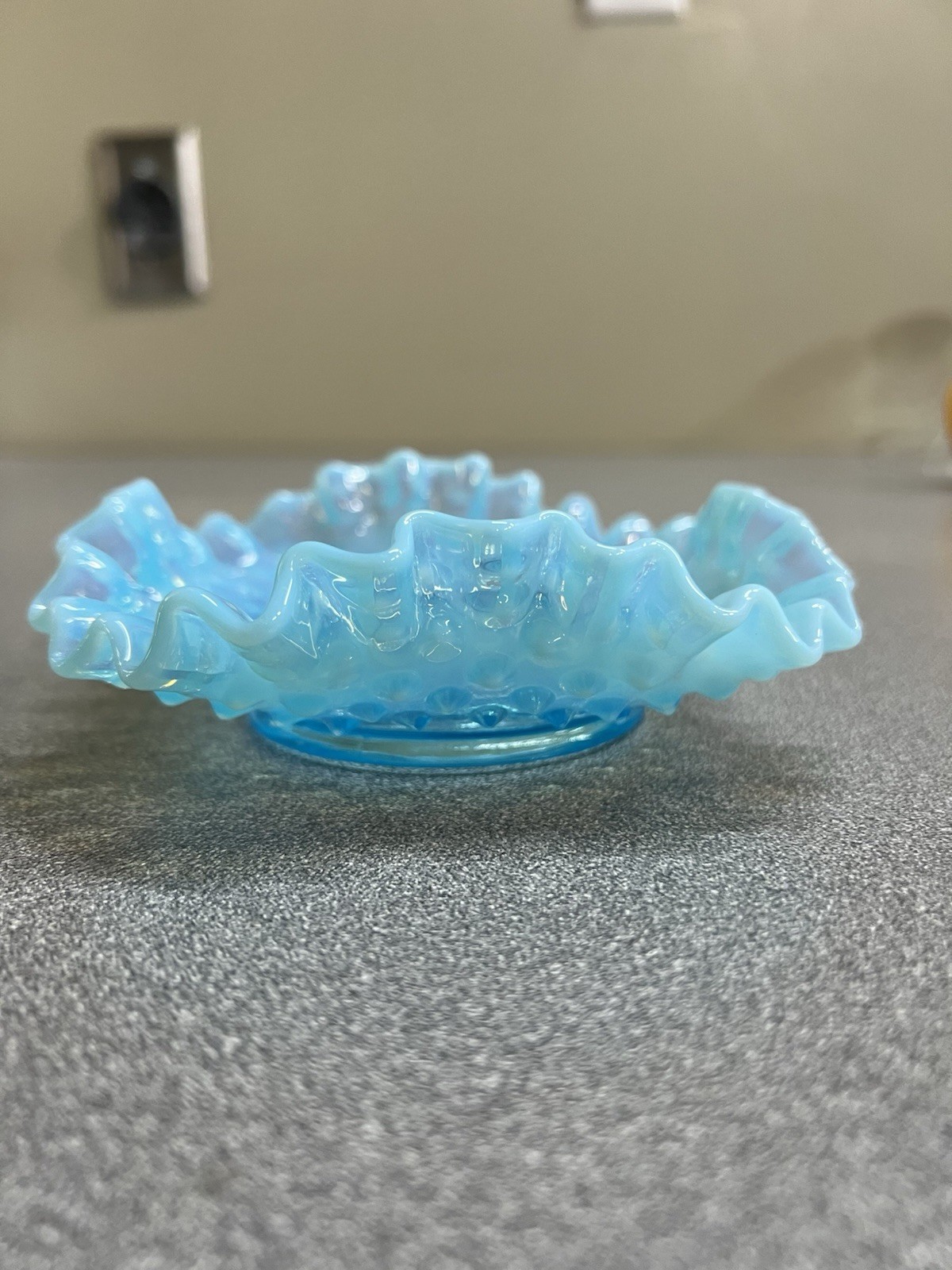 VTG Fenton Art Glass Bon Bon Dish Opalescent Blue Hobnail Double Crimp Ruffle. Condition is Used. Shipped with USPS Ground Advantage.