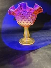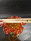 In excellent condition The VTG Fenton Glass Red Golden Amberina Ruffled Edge Thumbprint Compote Dish is a vintage candy dish featuring an English Hobnail pattern and a glossy finish. Hand blown in the United States during the 1960s, this art deco style dish is made of orange glass with a thumbprint design. The one compartment dish stands at 6 inches tall and 6 25 inches wide, making it a decorative piece with a unique American theme. It is recommended to hand wash only to preserve its original charm.