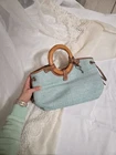 The VTG Fossil 1954 Classic Seafoam Green Woven Rattan Wood Handles Strap Bag Purse is a vintage-inspired handbag with a unique woven exterior made of wood, leather, and straw. The purse features multicolor rattan wood handles in a crossbody shoulder double top handle style, along with brown and silver hardware accents. With a medium size and lined interior complete with inner pockets and a mobile phone pocket, this limited edition bag is both stylish and functional, making it a versatile accessory for any classic lover.