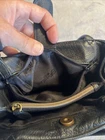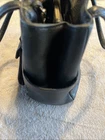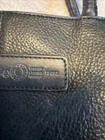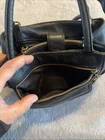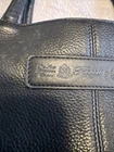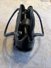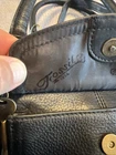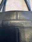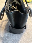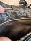 Beautiful black leather with lots of pockets. Comes with charm and shoulder strap. Zippers work great. Nice purse