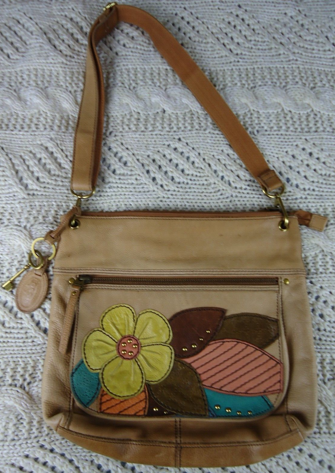 VTG Fossil Soft Leather Floral Cognac Brown Shoulder Bag BOHO Hippie Earthy Y2K 90s Logo Tag Key Metal Stud Accents. Perfectly broke in soft leather.
